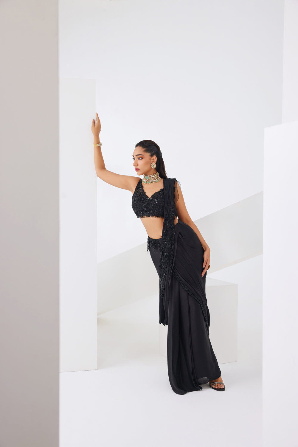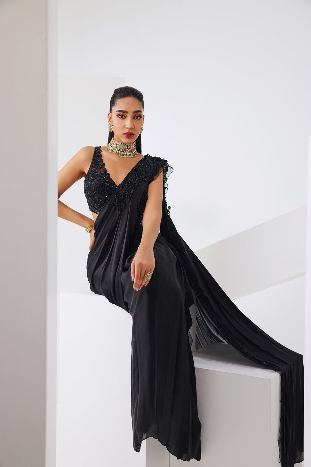 Pre-draped saree in black with fully embroidered blouse.