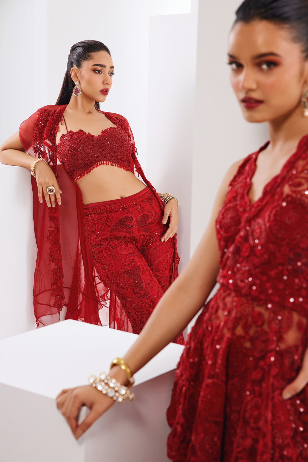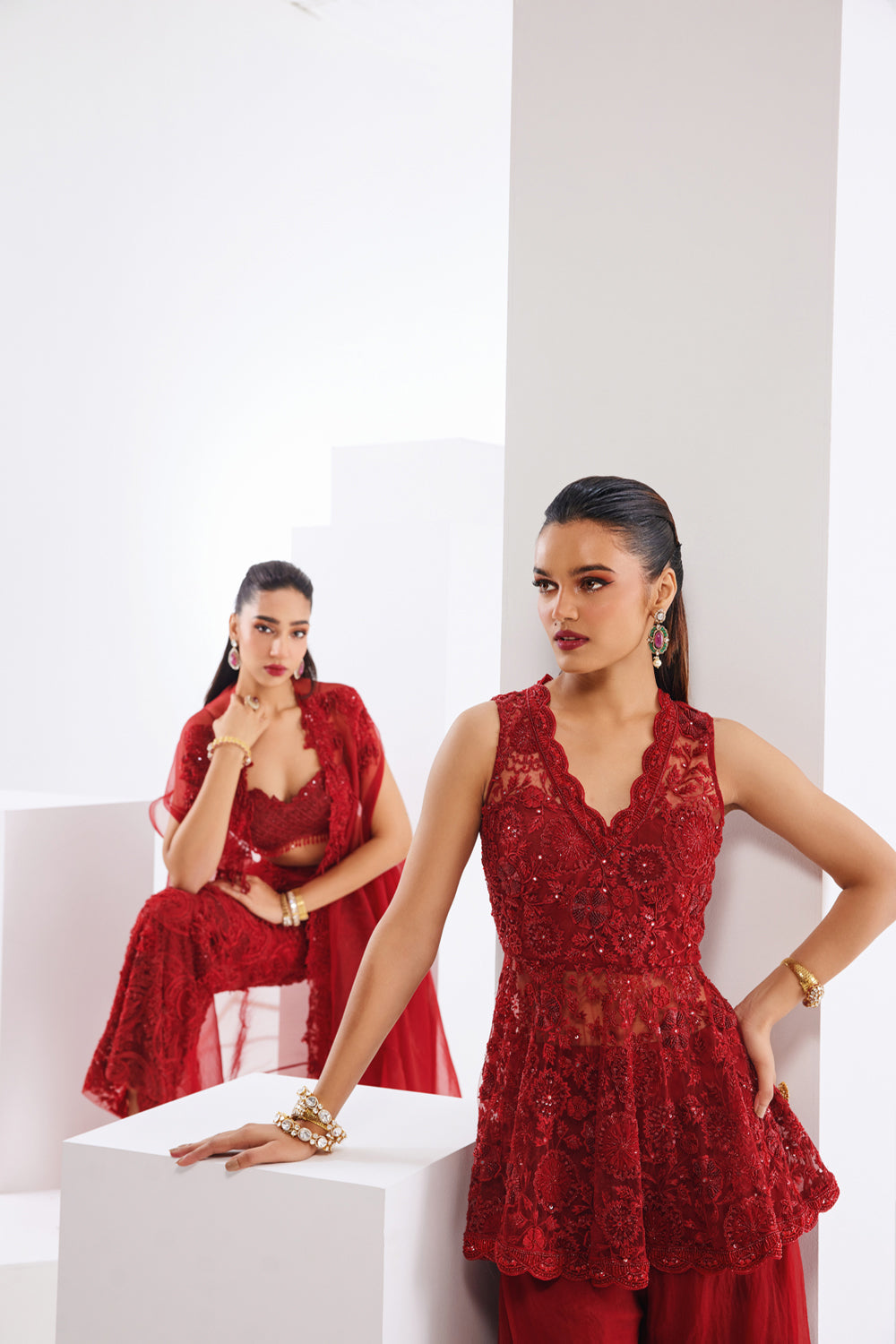 Red floral embroidered cut sleeves pepelum with plain red flared pants.