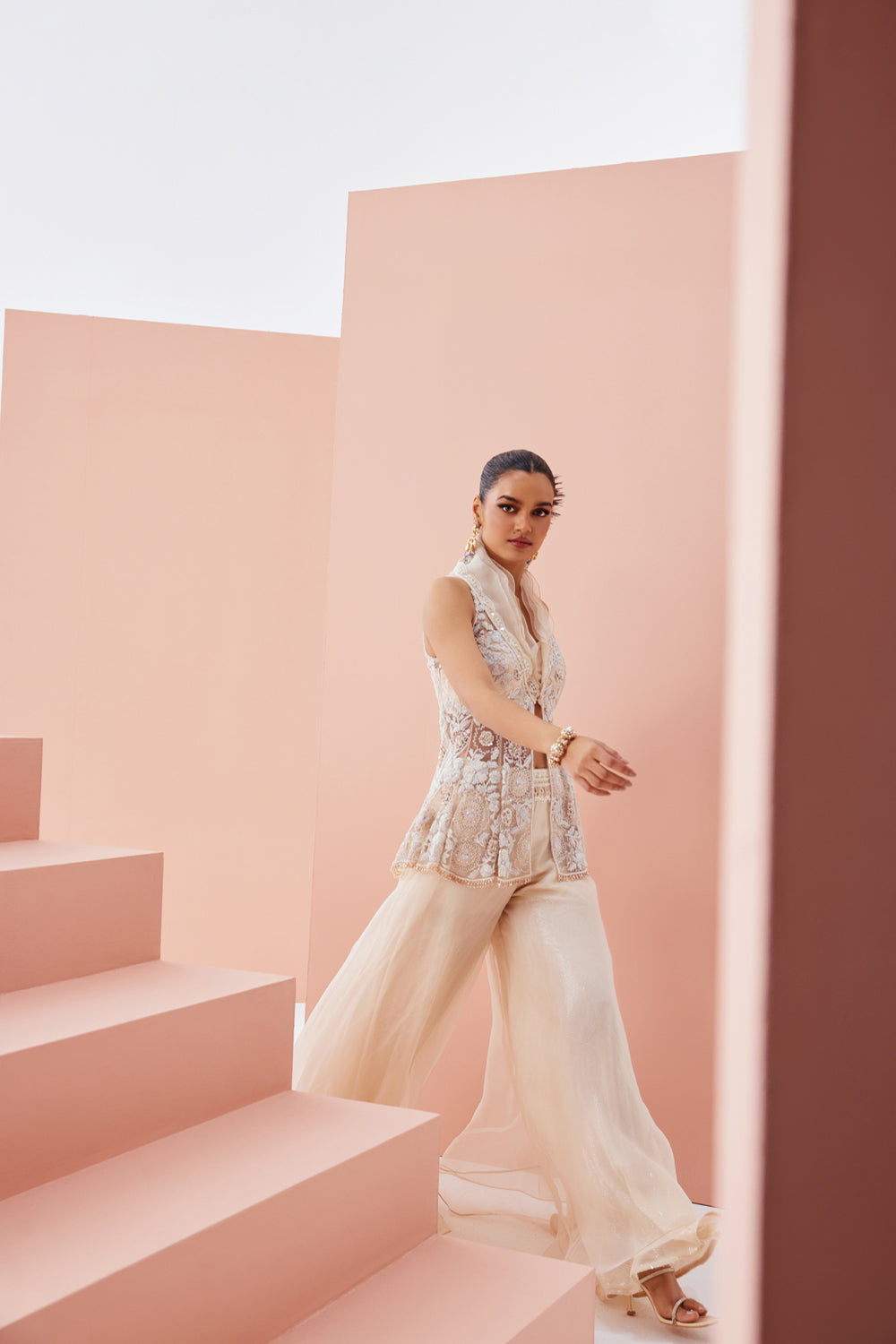 Short ivory embroidered peplum with flared pants and ruffled dupatta.