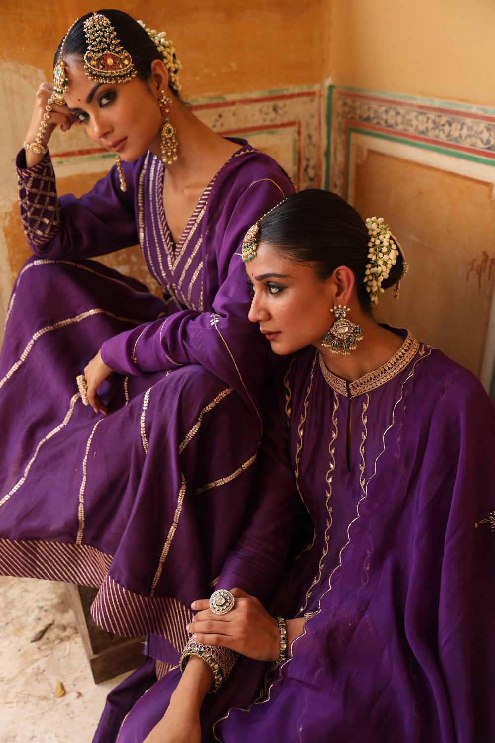 Add a touch of sophistication to your festive collection with the Kilol Anarkali Set, crafted in luxurious silk and lined with soft 100% cotton. The elegant purple Anarkali features detailed hand pitta embroidery, showcasing exquisite craftsmanship. This 2-piece stitched ensemble includes a 52-inch Anarkali and a 2.5-meter dupatta, making it an ideal choice for weddings and festive occasions.