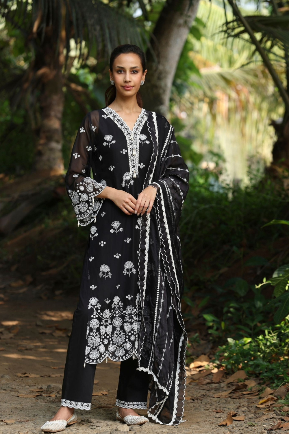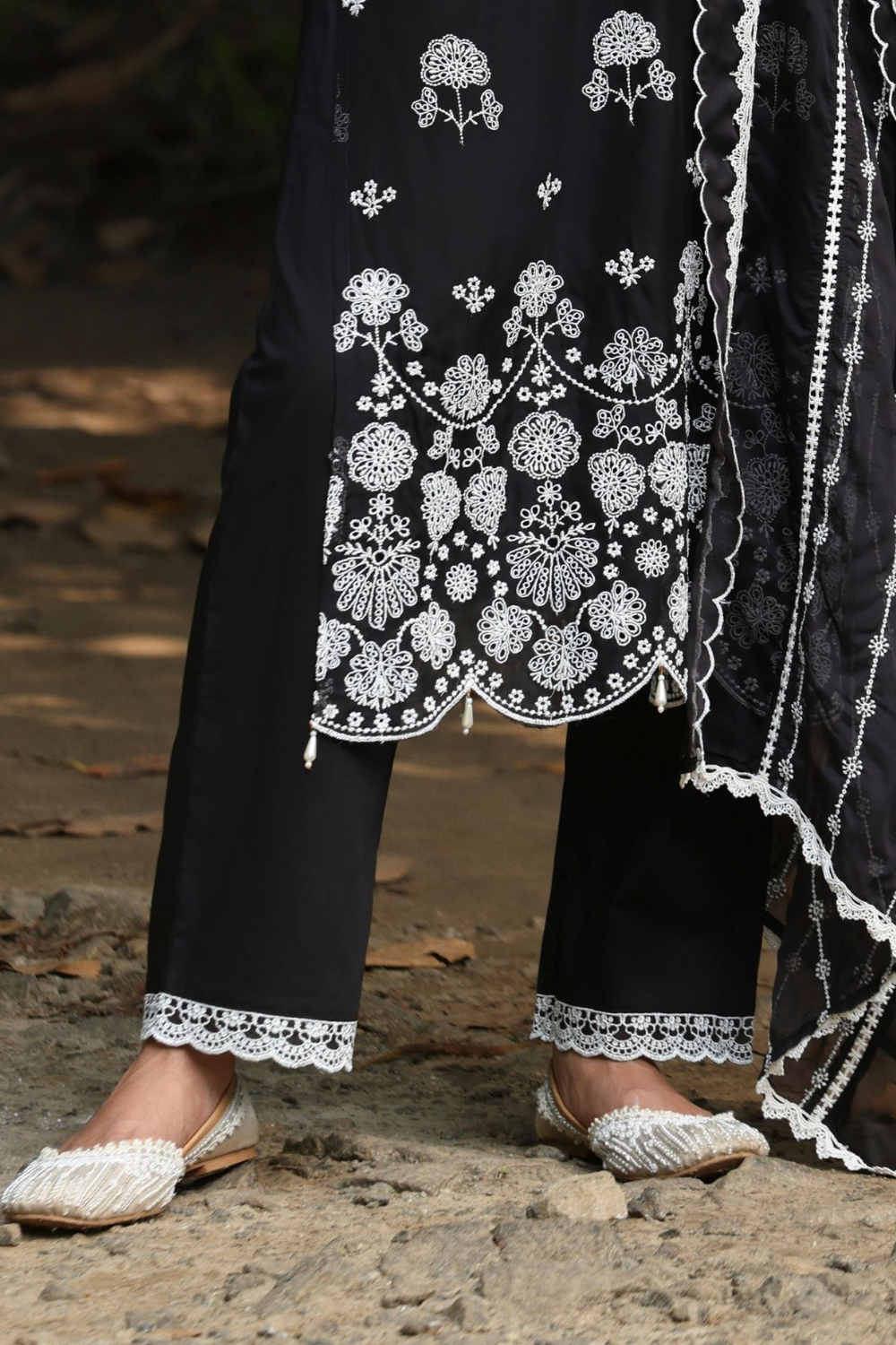 Paired with straight-fit black pants and the dupatta with subtle white accents and a scalloped border, complete the look with finesse. Ideal for evening gatherings and festive occasions, this kurta set is a statement of effortless charm and refined style.
