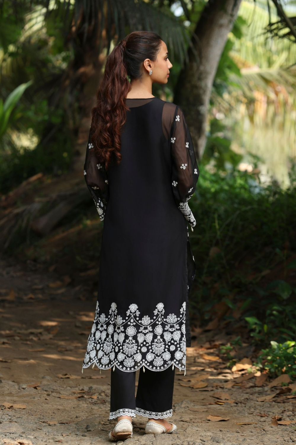 This kurta set in classic black with intricate white embroidery is the epitome of timeless elegance. The kurta features a V-neckline adorned with delicate lace detailing, and the contrast of white floral motifs against the deep black fabric creates a striking visual appeal. The flared sleeves, finished with scalloped lace edges and pearl hangings, add a touch of sophistication and grace.