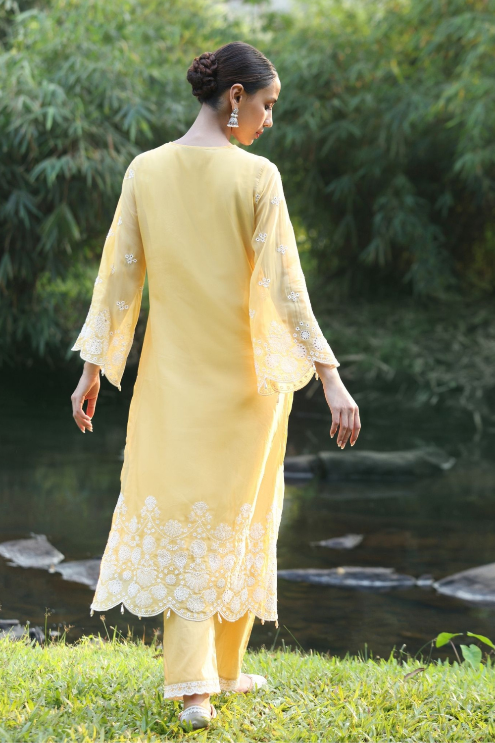 This kurta set is a vision of elegance in a soft beige hue, adorned with intricate white thread embroidery that captures the essence of timeless grace. The kurta features a V-neckline framed by delicate lace detailing, with embroidered floral motifs all over. The flared sleeves, accentuated with scalloped lace edges and pearl hangings, enhance its ethereal appeal.