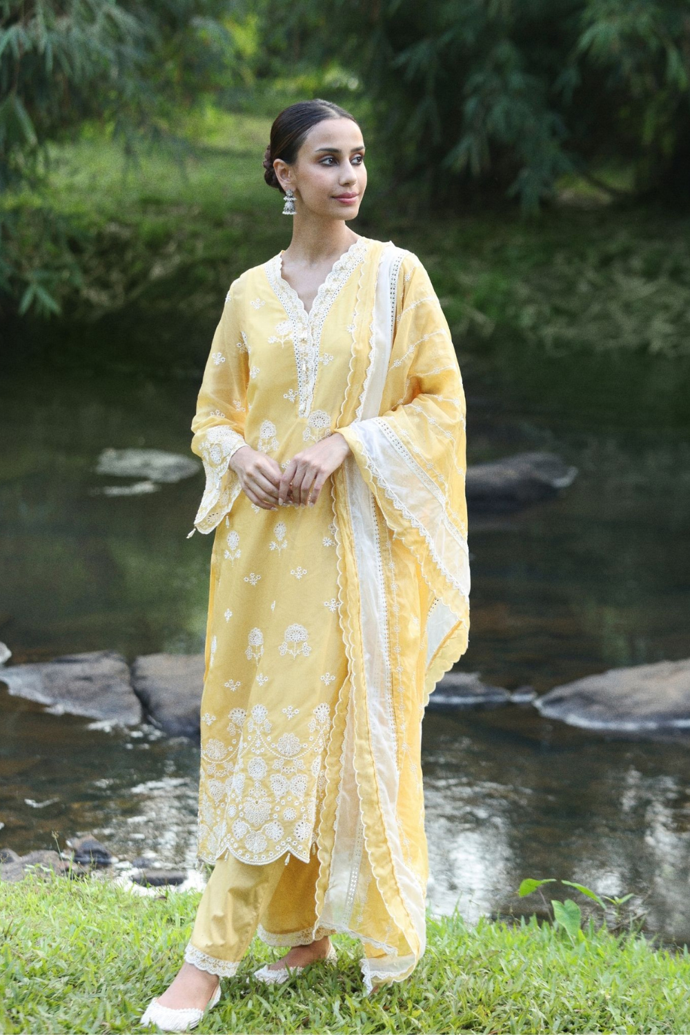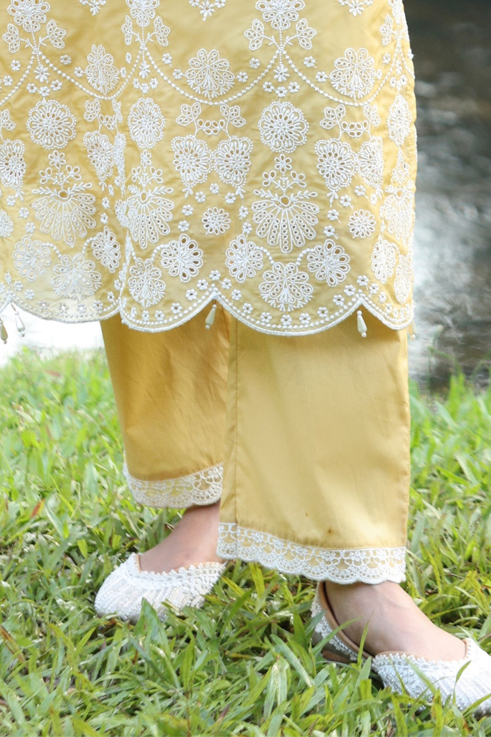 The scallop hem of the kurta is paired with straight pants with matching lace cuffs. The dupatta showcases subtle lace details and a scalloped border, tying the look together effortlessly. This kurta set is an ideal choice for daytime festivities and intimate celebrations, exuding charm and finesse in every stitch.