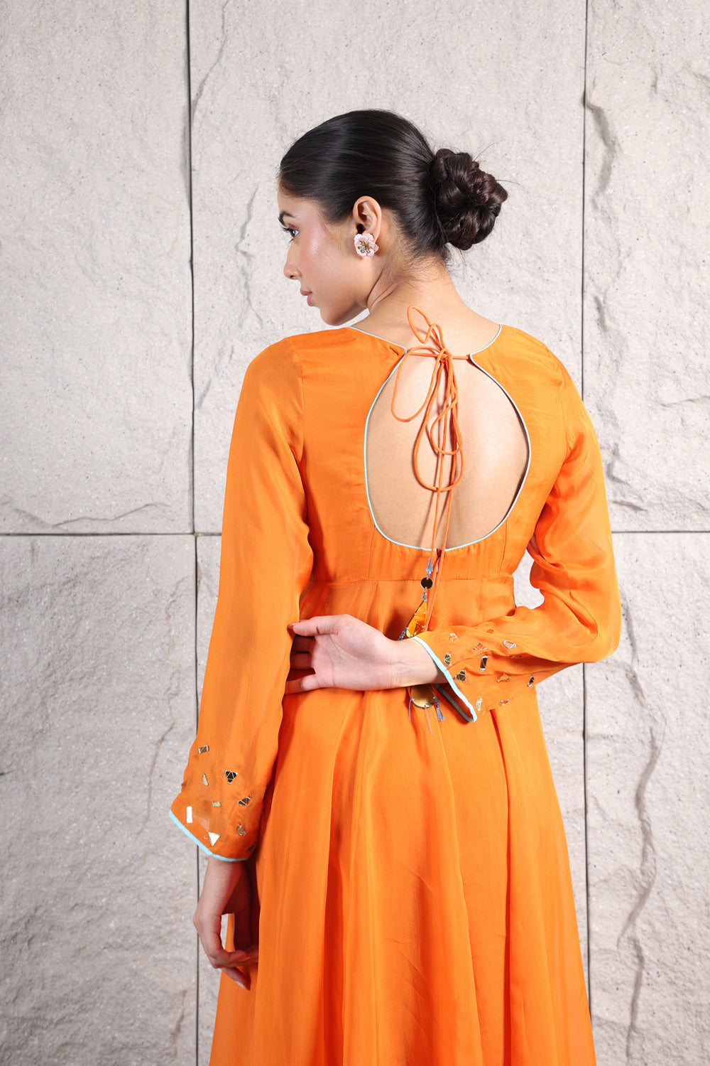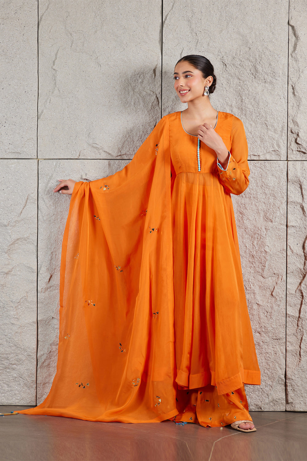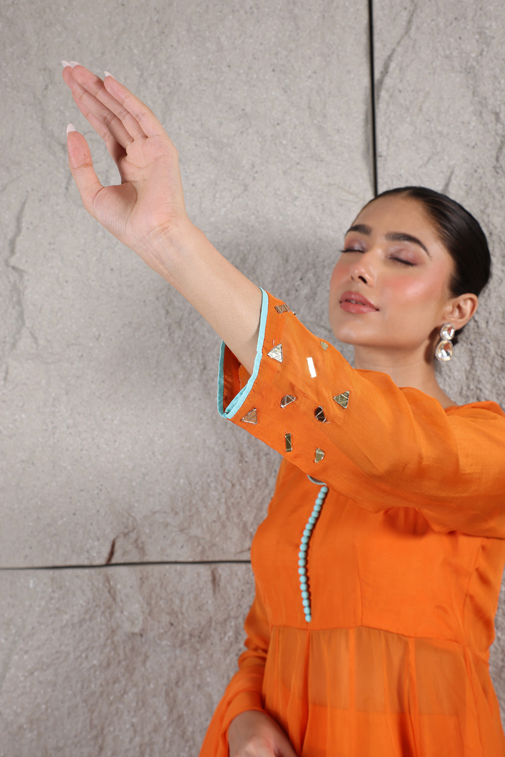 Orange organza anarkali with turqouise blue detailing and full sleeves embroidered at hem, paired with straight plazzo and organza duppatta adorned with hangings.