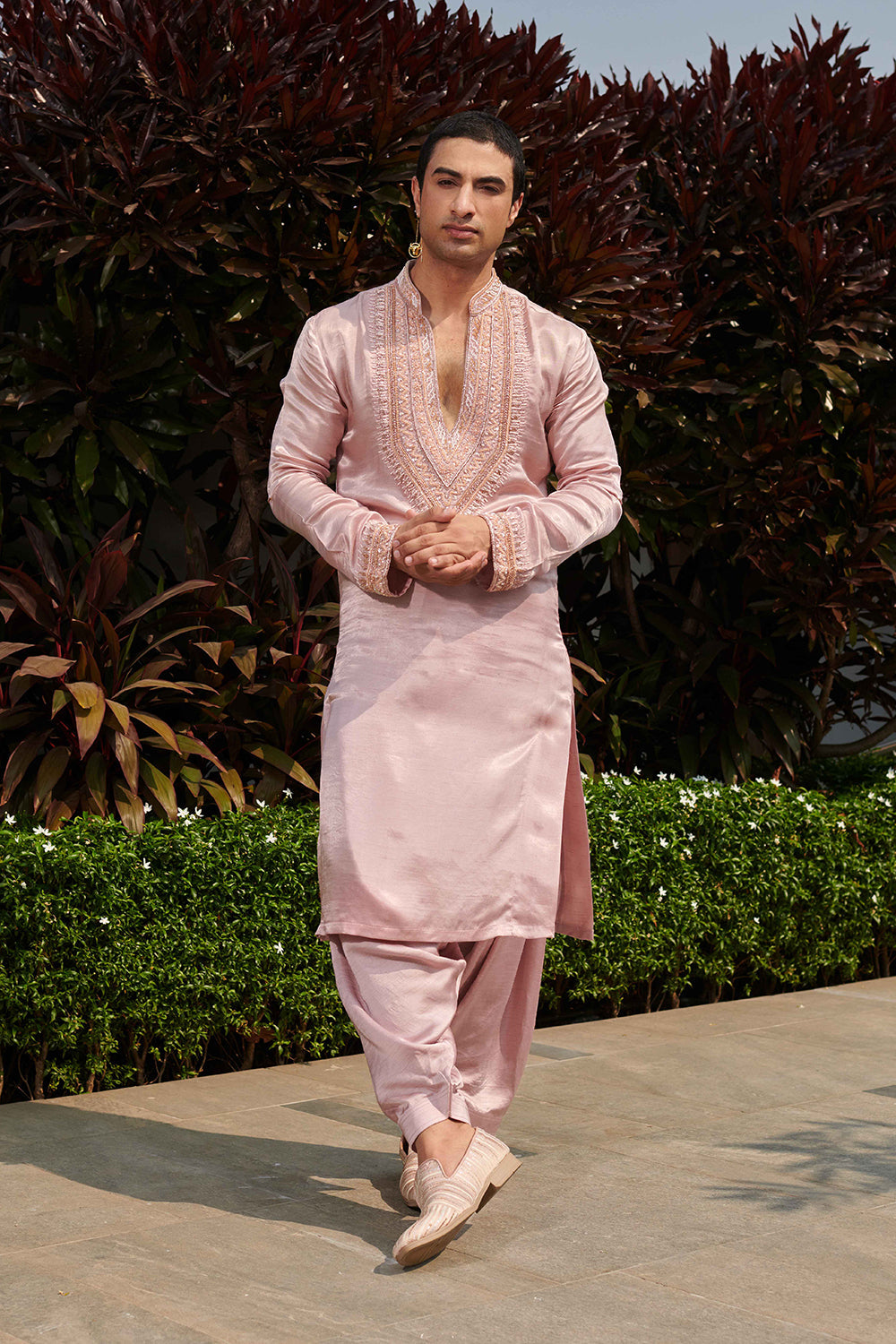 This outfit is a stunning kurta and patiyala set, designed for elegance and comfort, making it a perfect choice for weddings, festive celebrations, and cultural events. The kurta is giving it a refined and regal look. It features a deep V-shaped neckline adorned with intricate tonal embroidery, extending gracefully to the cuffs, adding an element of sophistication and tradition. The full-length sleeves and straight silhouette enhance its timeless appeal. The salwar is designed for a relaxed yet structured fit, complementing the kurta beautifully. Its slightly pleated and tapered design ensures ease of movement while maintaining a stylish and polished look.