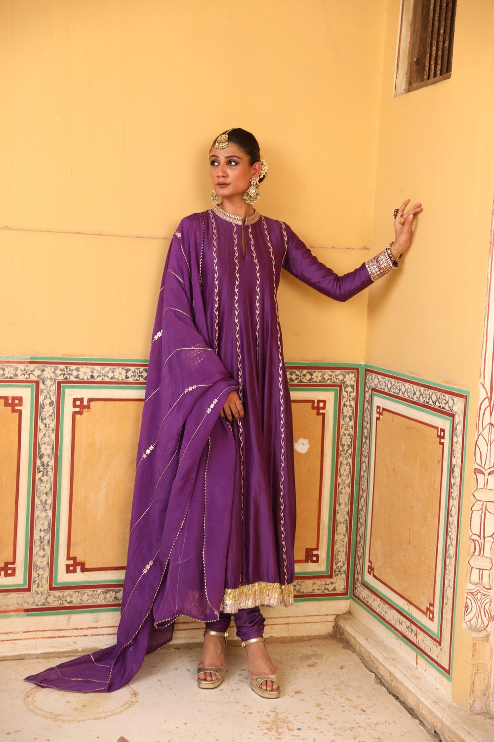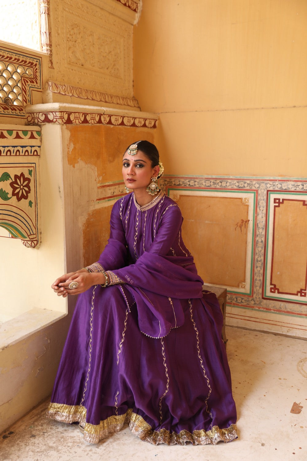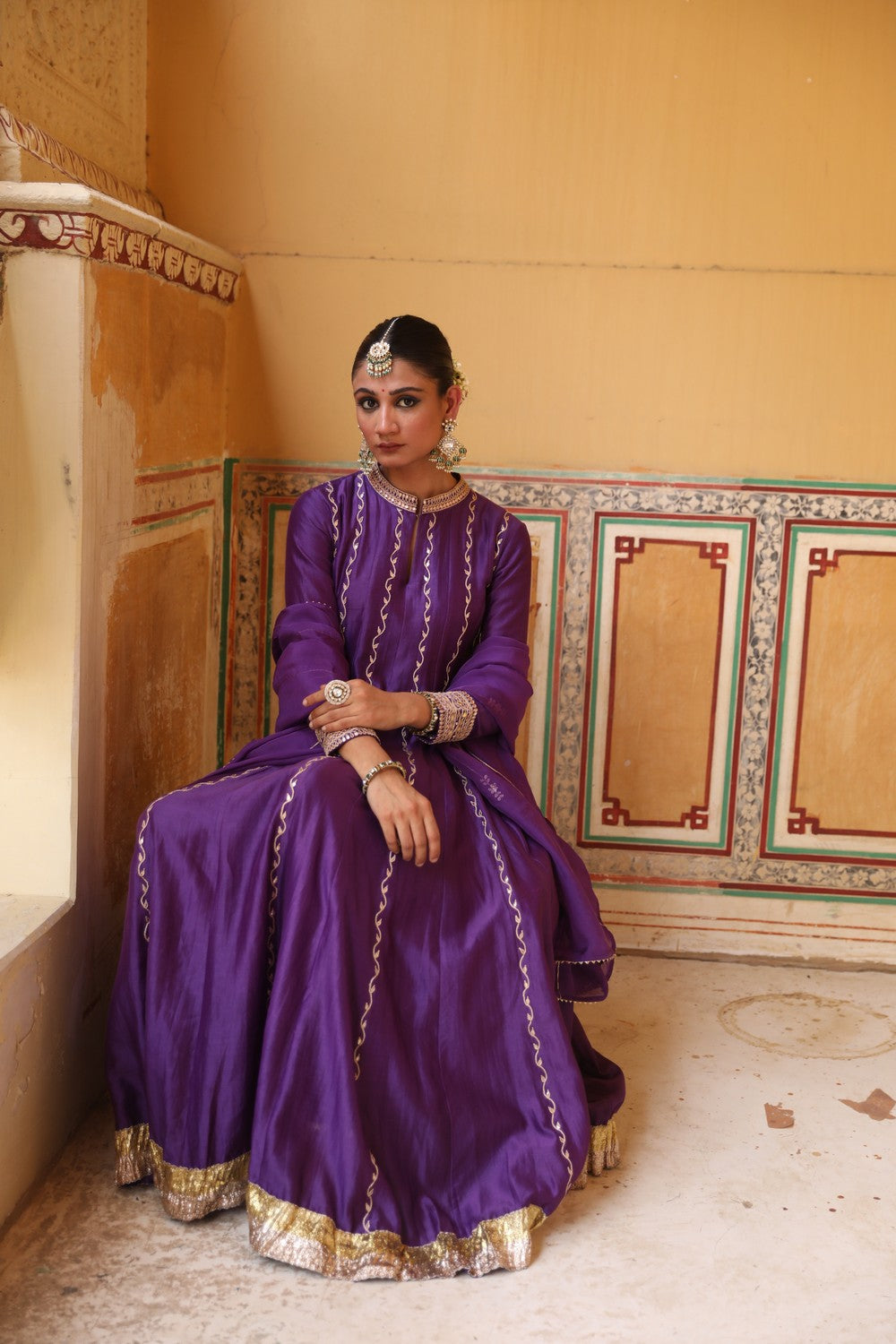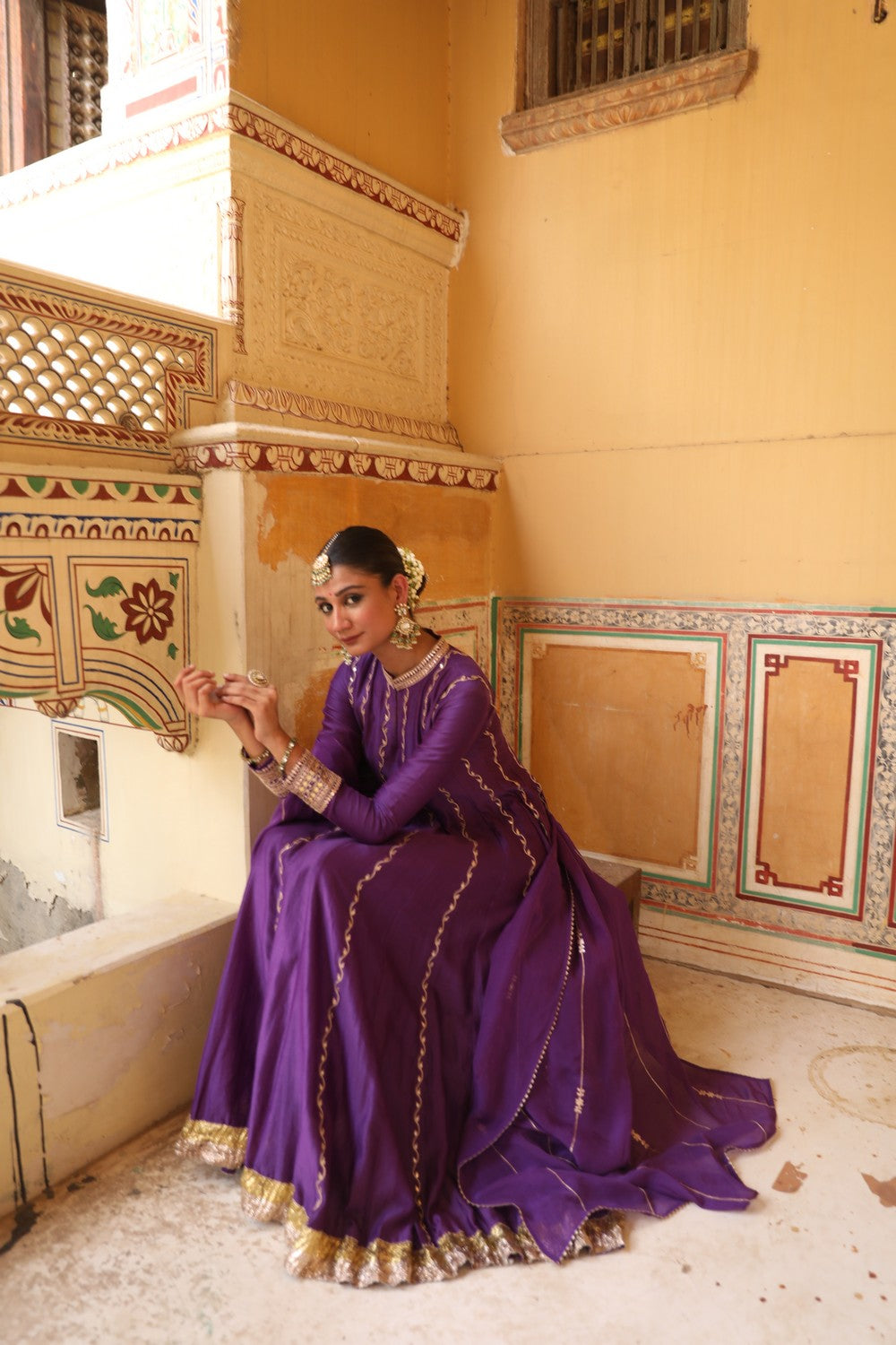 Step into elegance with the Kundan Anarkali Set, designed in luxurious silk and lined with 100% cotton for a comfortable and graceful fit. The regal purple Anarkali is adorned with intricate gota handwork, adding a touch of traditional charm. This 2-piece stitched set includes a flowing 54-inch Anarkali and a 2.5-meter dupatta, perfect for festive events and celebrations.