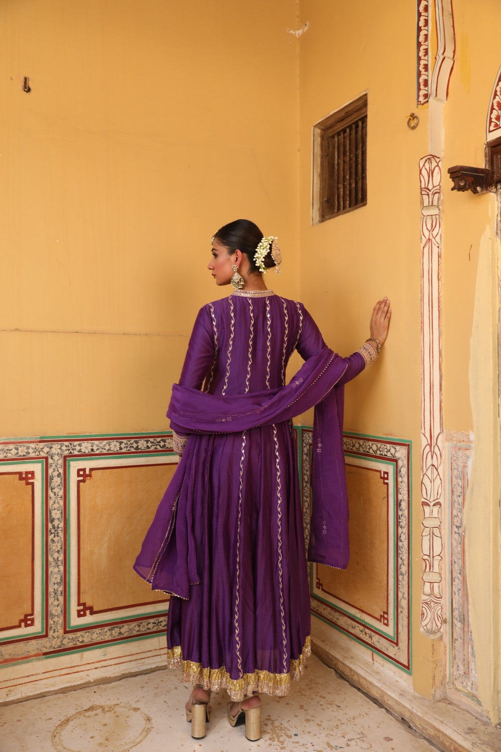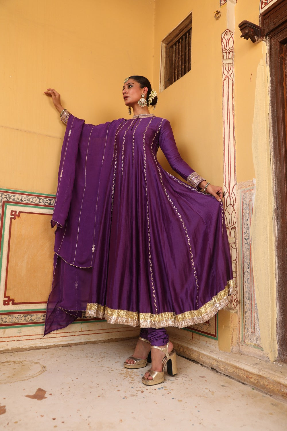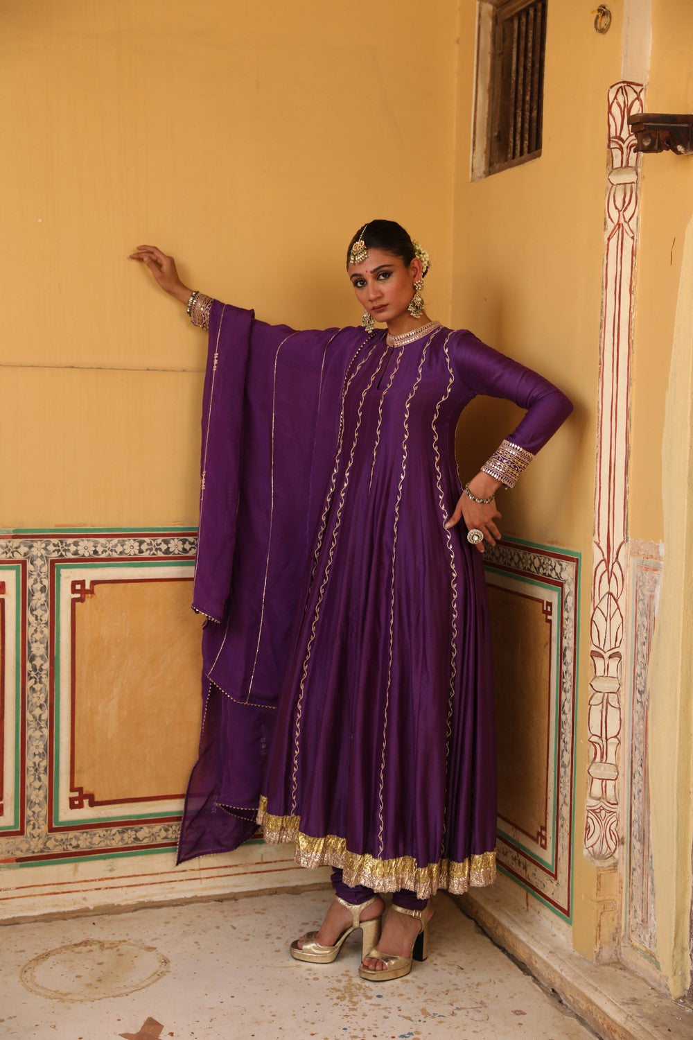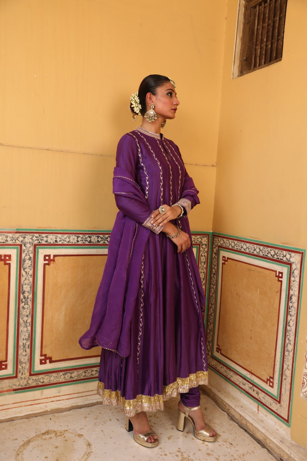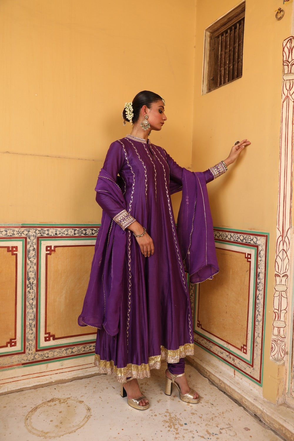 Step into elegance with the Kundan Anarkali Set, designed in luxurious silk and lined with 100% cotton for a comfortable and graceful fit. The regal purple Anarkali is adorned with intricate gota handwork, adding a touch of traditional charm. This 2-piece stitched set includes a flowing 54-inch Anarkali and a 2.5-meter dupatta, perfect for festive events and celebrations.