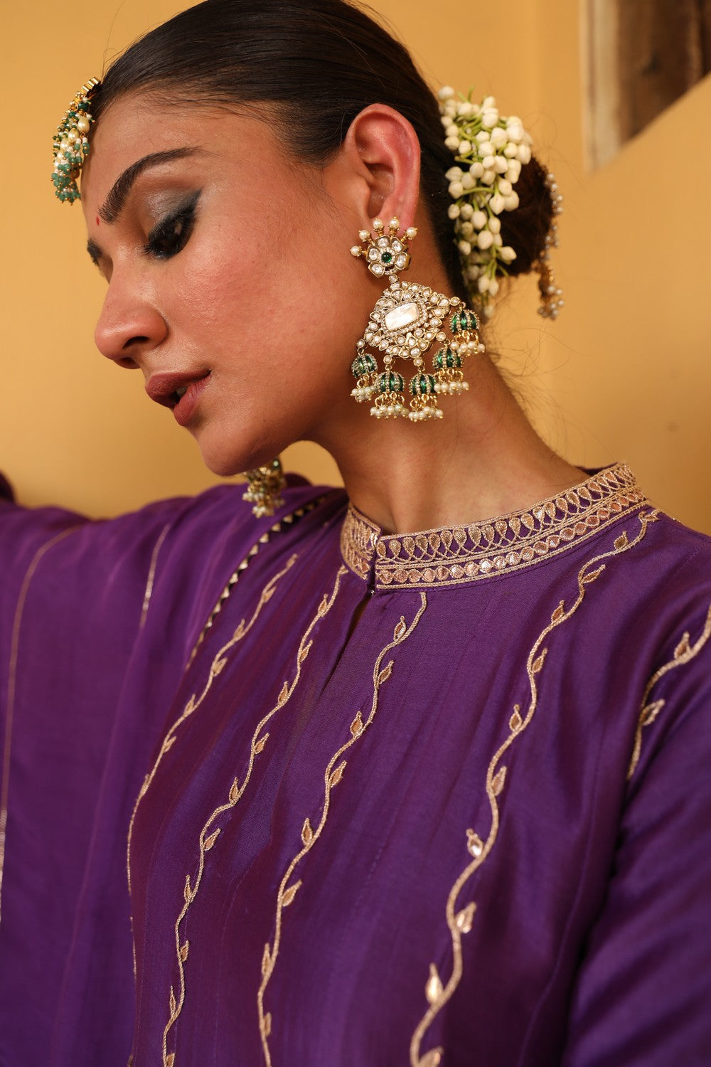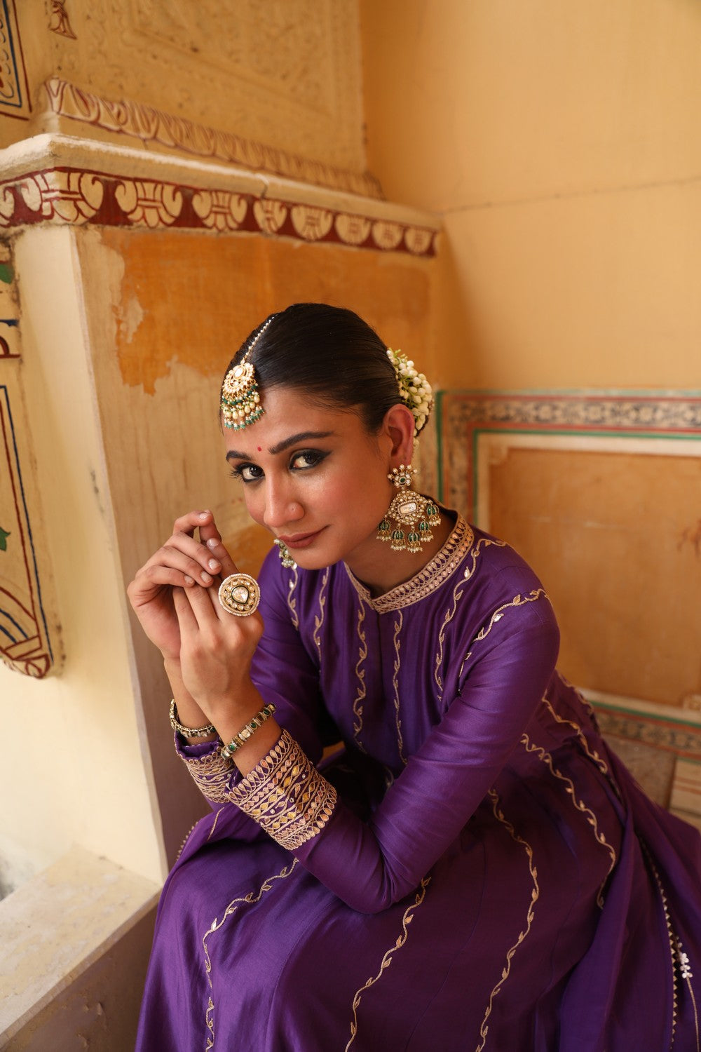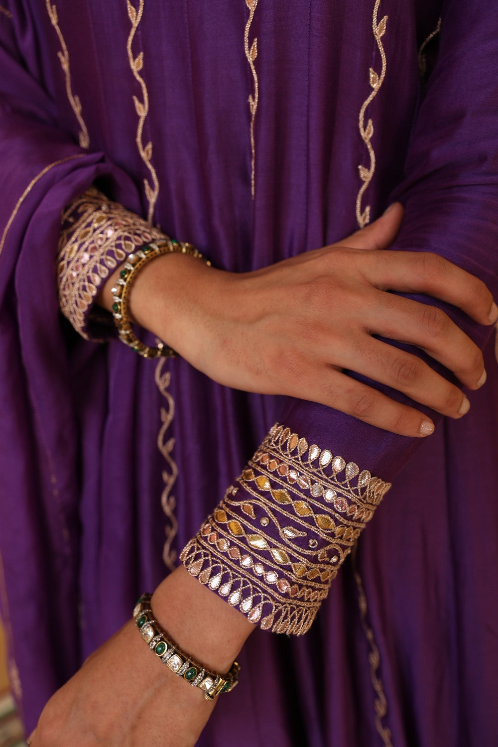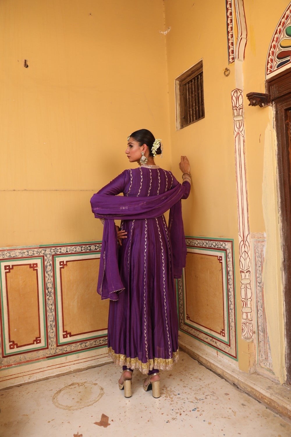 Step into elegance with the Kundan Anarkali Set, designed in luxurious silk and lined with 100% cotton for a comfortable and graceful fit. The regal purple Anarkali is adorned with intricate gota handwork, adding a touch of traditional charm. This 2-piece stitched set includes a flowing 54-inch Anarkali and a 2.5-meter dupatta, perfect for festive events and celebrations.