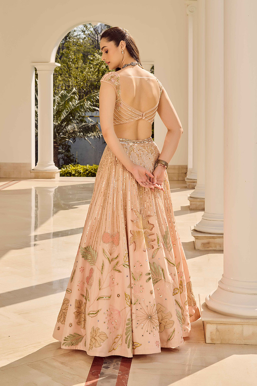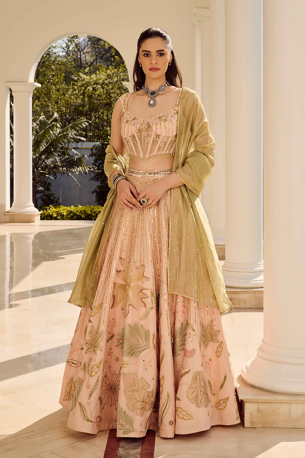 A lehenga, intricately hand-embroidered with sequins, mirrors, and zardosi, featuring exquisite applique work of silk tissue and velvet. Paired with a corset blouse and a delicate silk tissue dupatta.