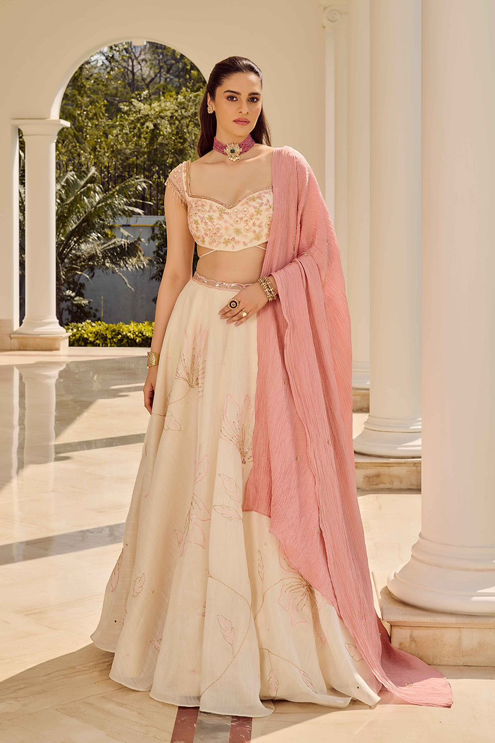 A stunning white textured lehenga adorned with floral sequin embroidered motifs, paired with a heavily embellished blouse and a delicate pink crushed silk tissue dupatta