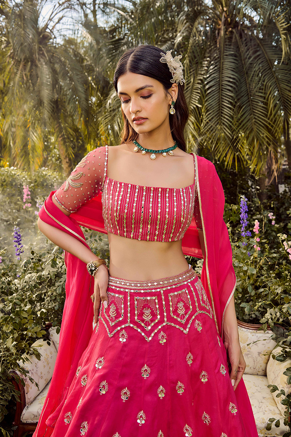 A stunner fully embellished lehenga with mirrors, zari, and zardozi work, Paired with a sophisticated square neckline blouse and a lightweight silk organza dupatta