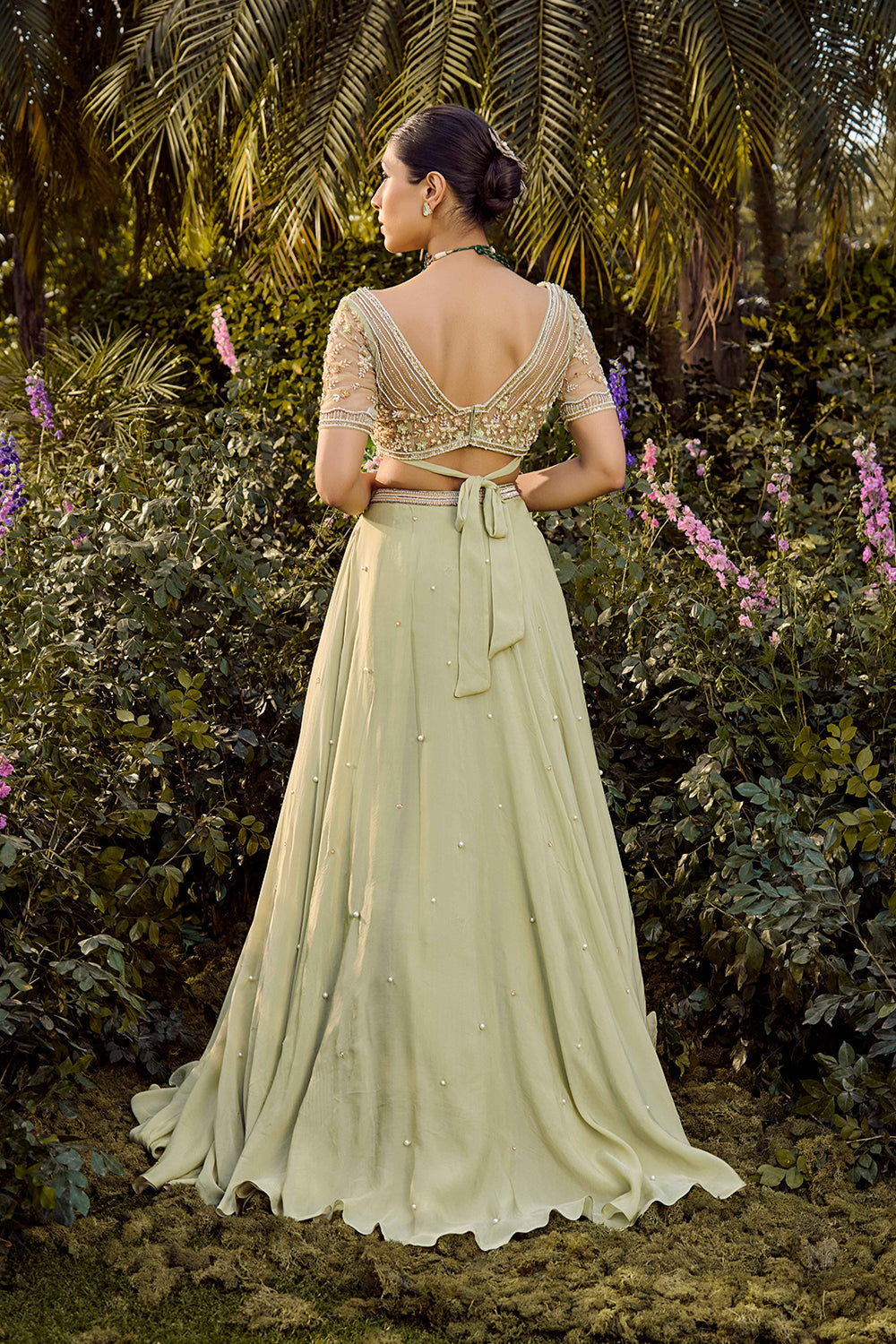 A graceful pista green lehenga featuring intricate pearl embroidery. Paired with a fully embellished blouse and a floral embroidered silk organza dupatta