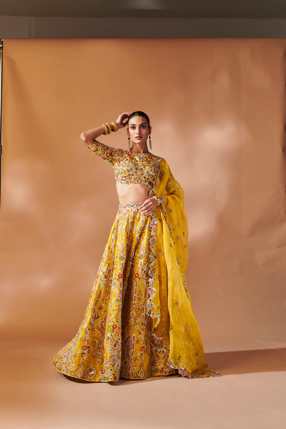 Mustard lehenga with multicoloured intricate embroidery with an elbow length sleeve blouse and organza embellished dupatta