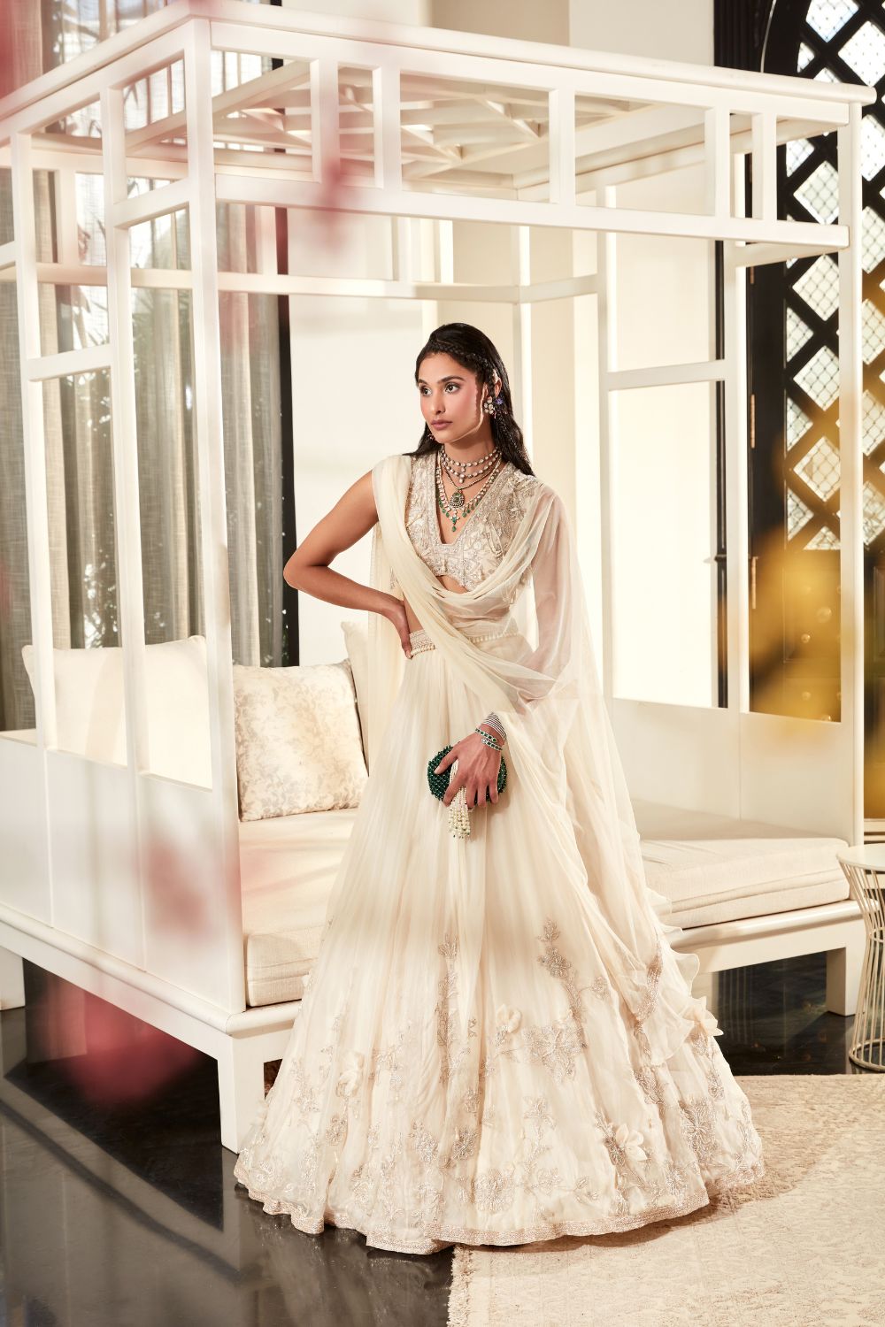 Embroidered organza lehenga with net blouse and ruffled dupatta and embroidred belt.