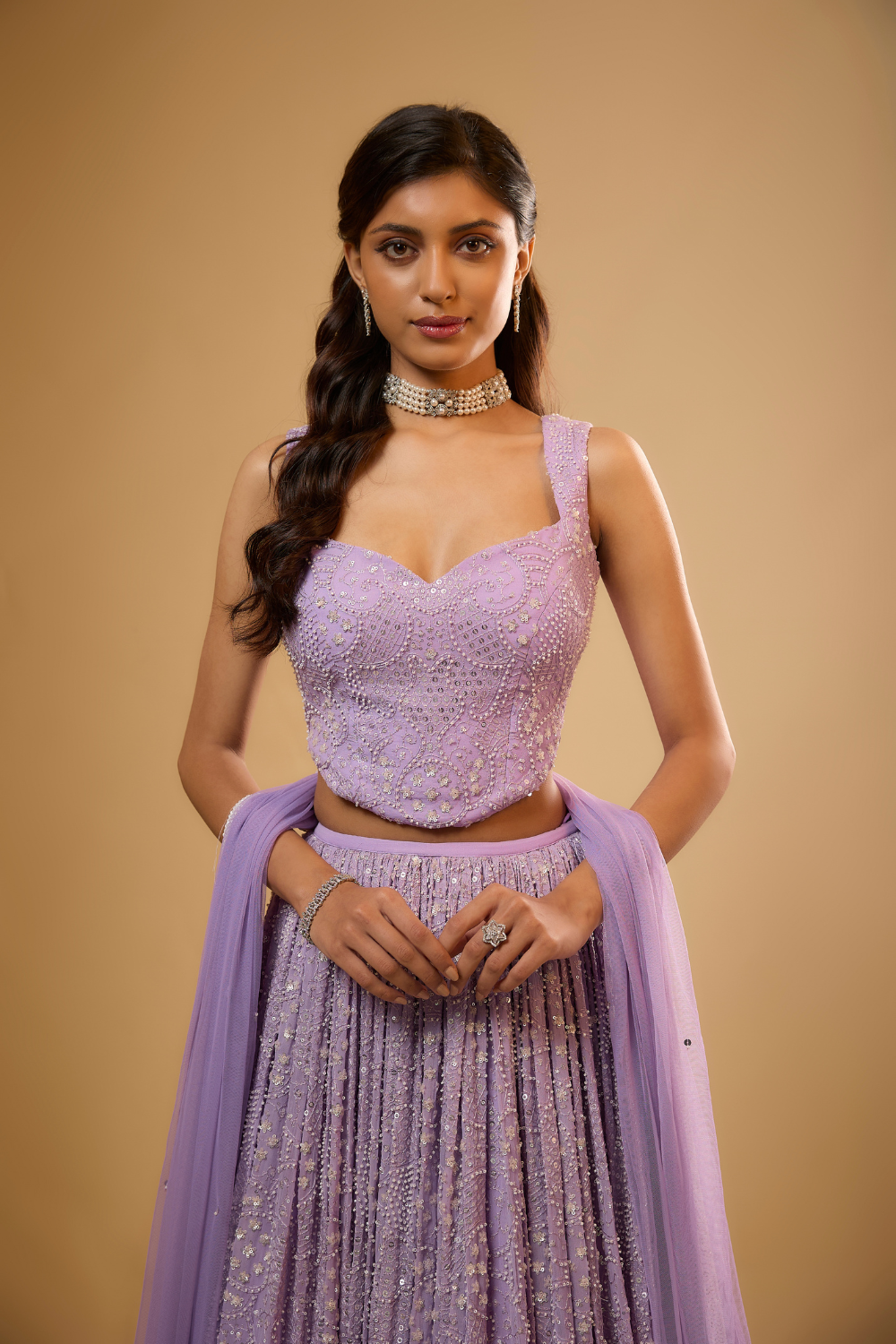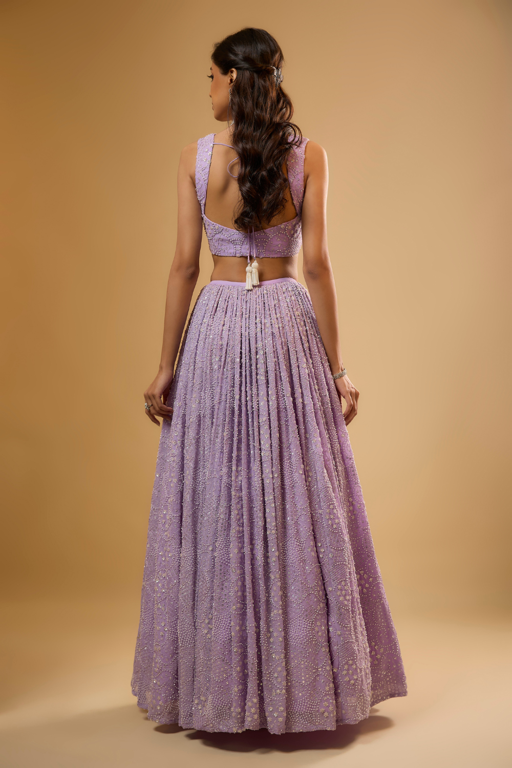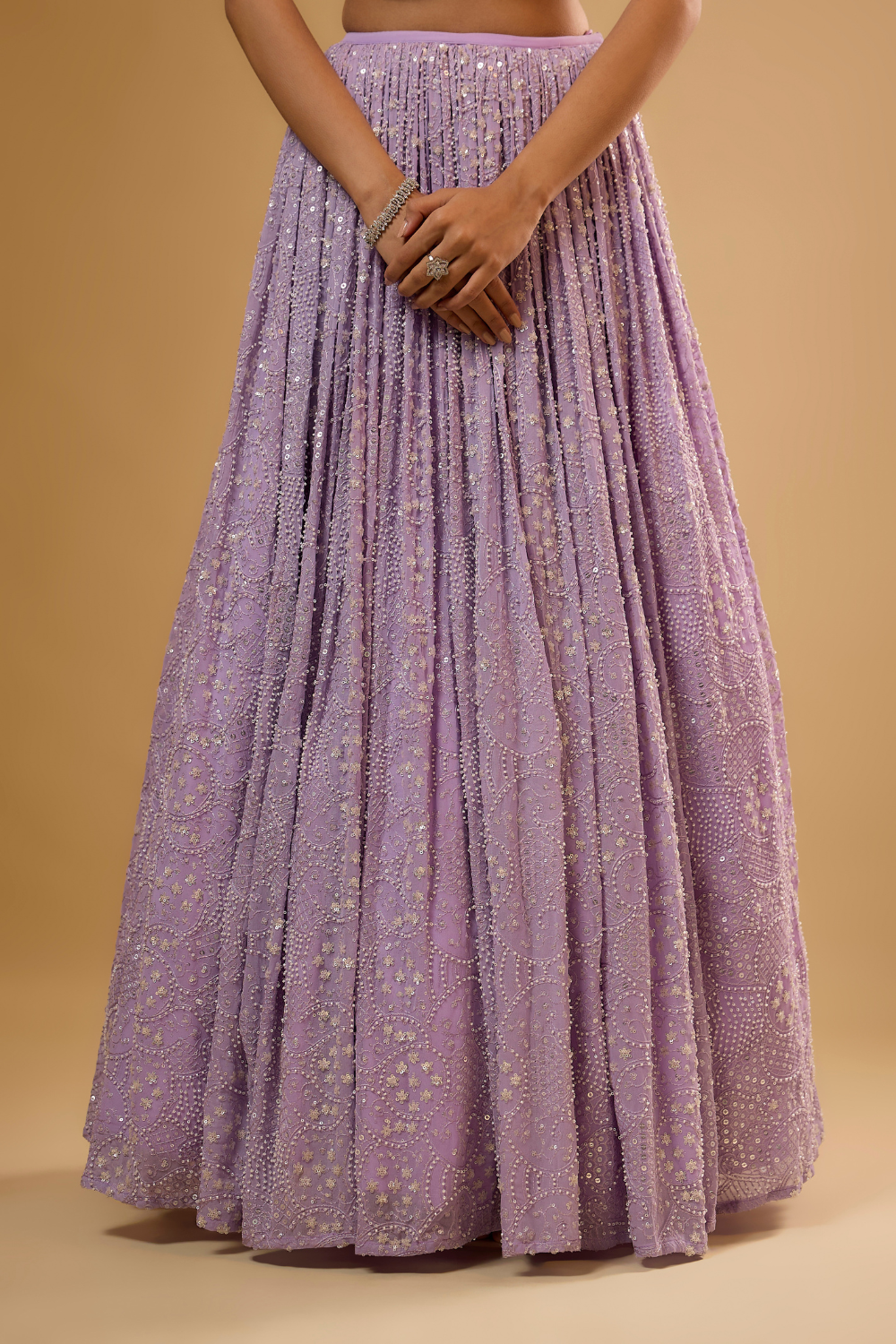 Lavender georgette lehenga set embroidered with sequins, glass beads & threadwork