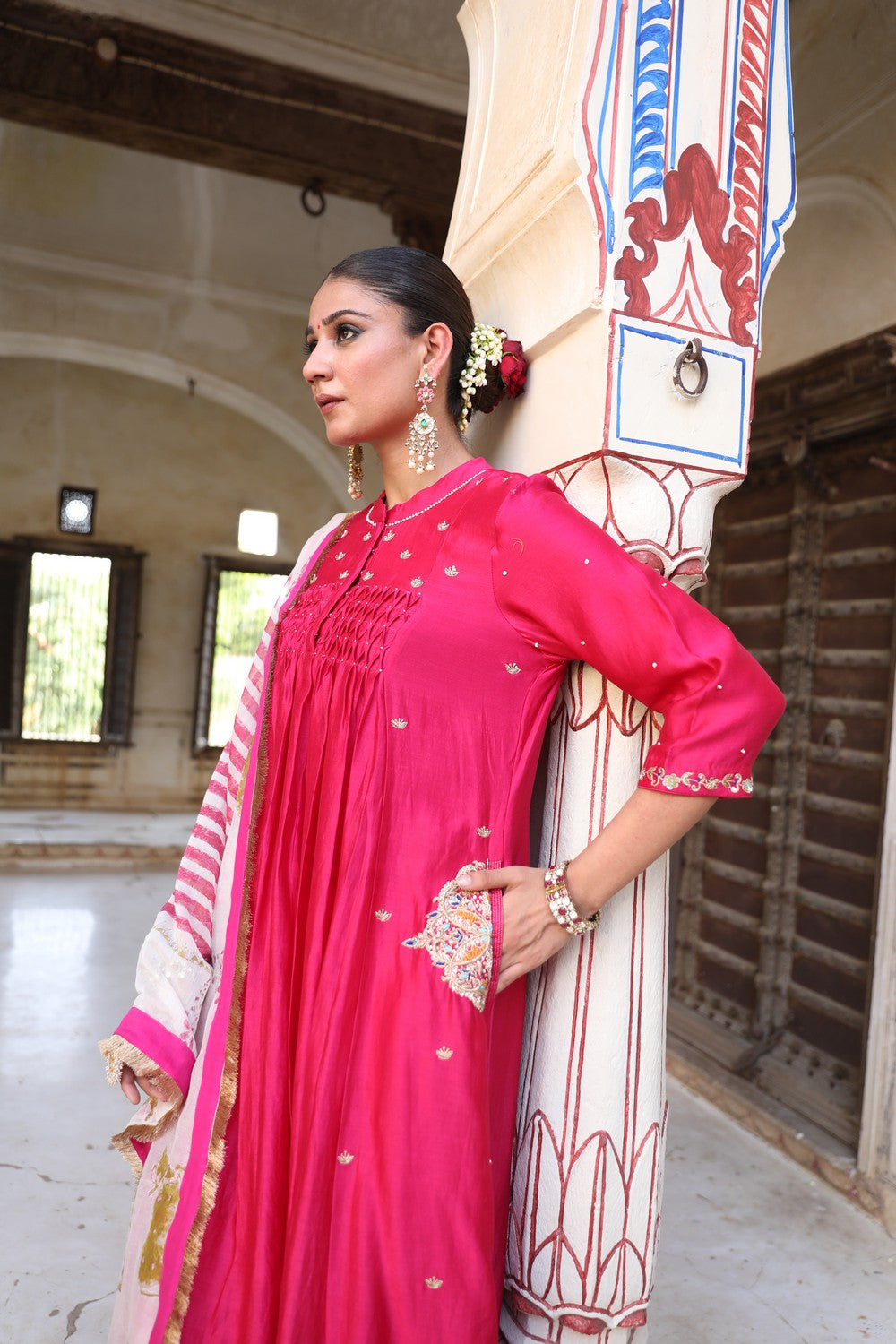 Step into sophistication with our Laxmi Rani Kali Suit Set, crafted in luxurious silk and lined with soft 100% cotton. The vibrant Rani pink hue, combined with intricate zardosi hand embroidery, gives this suit a royal and festive appeal. This 3-piece stitched ensemble includes a 48-inch kali suit, a 39-inch pant, and a 2.5-meter dupatta, making it perfect for special occasions and celebrations.