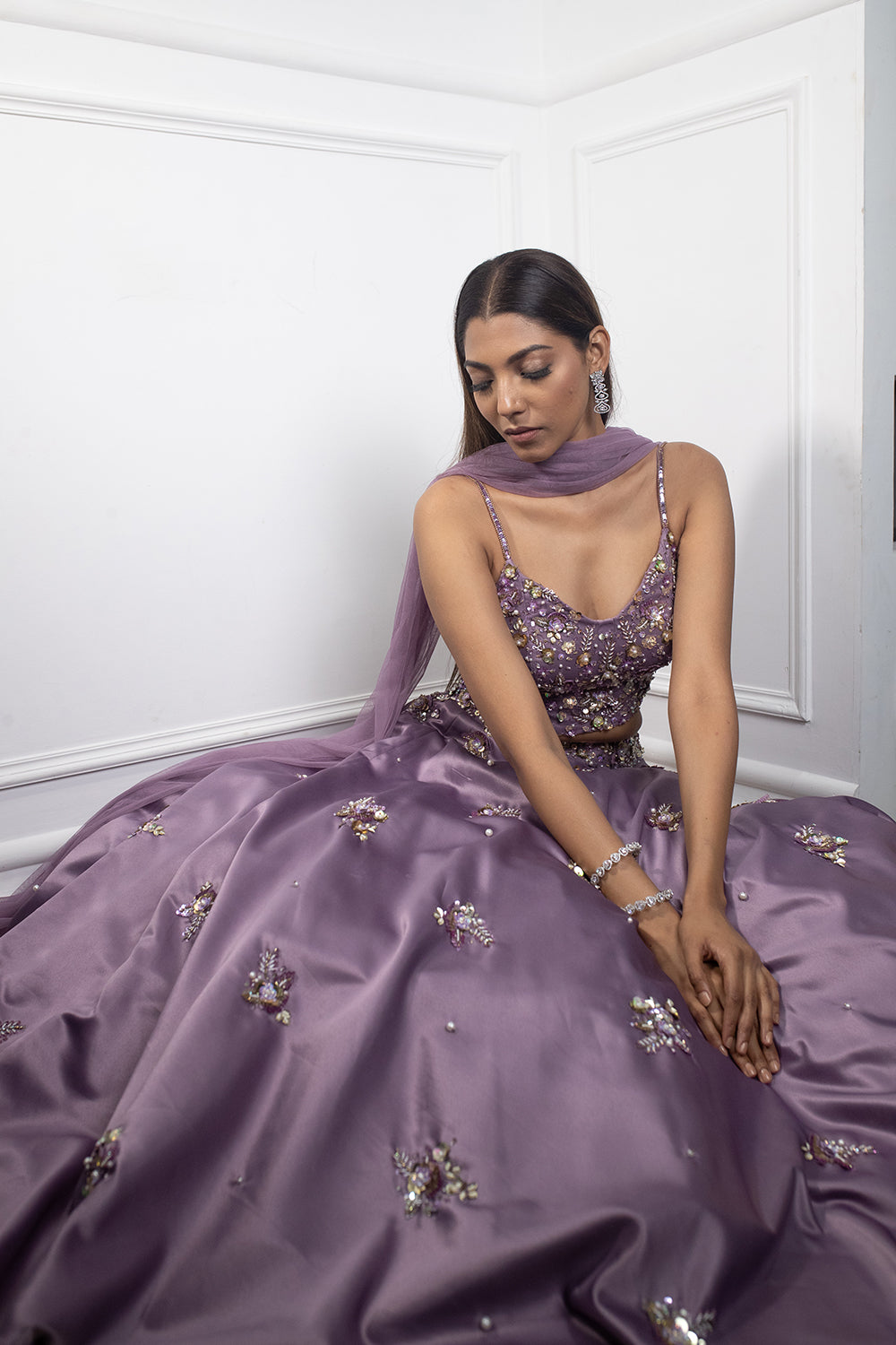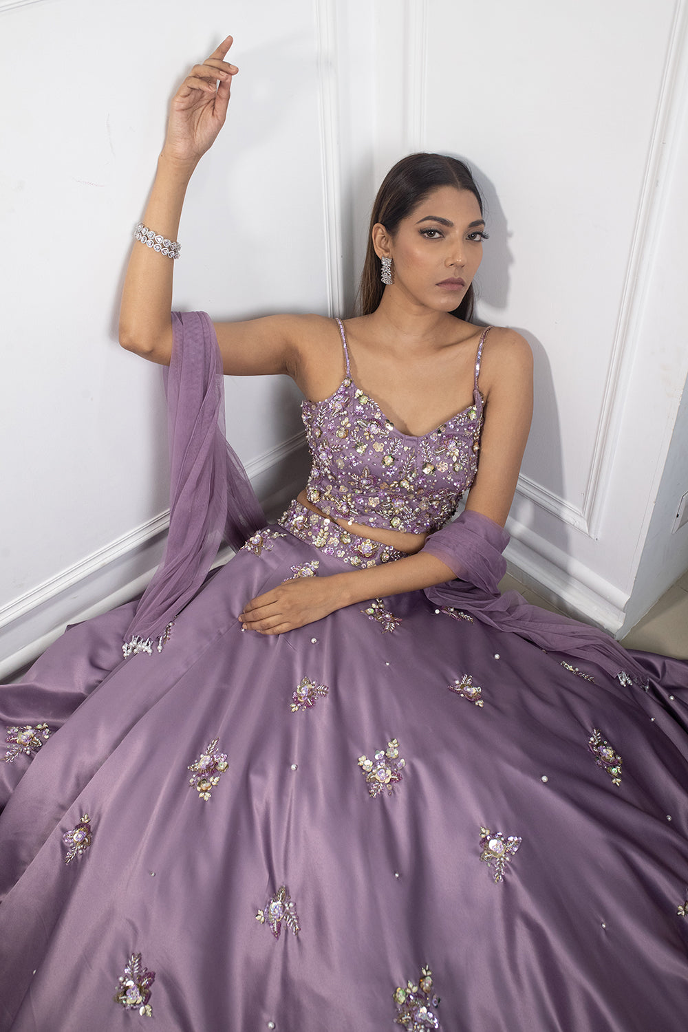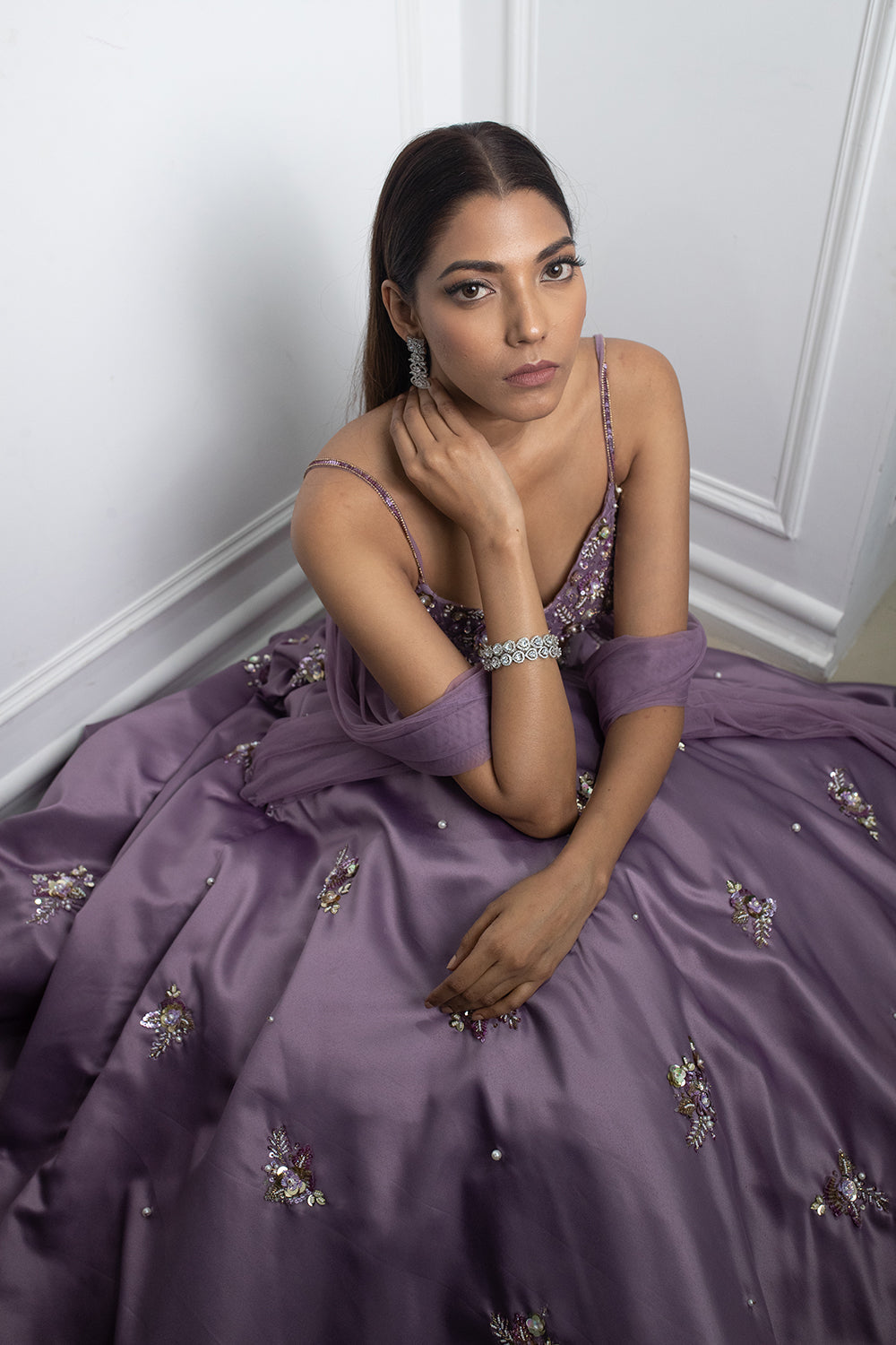 A blush tone of lilac with sheen of satin and 3d embedded floral detailing.