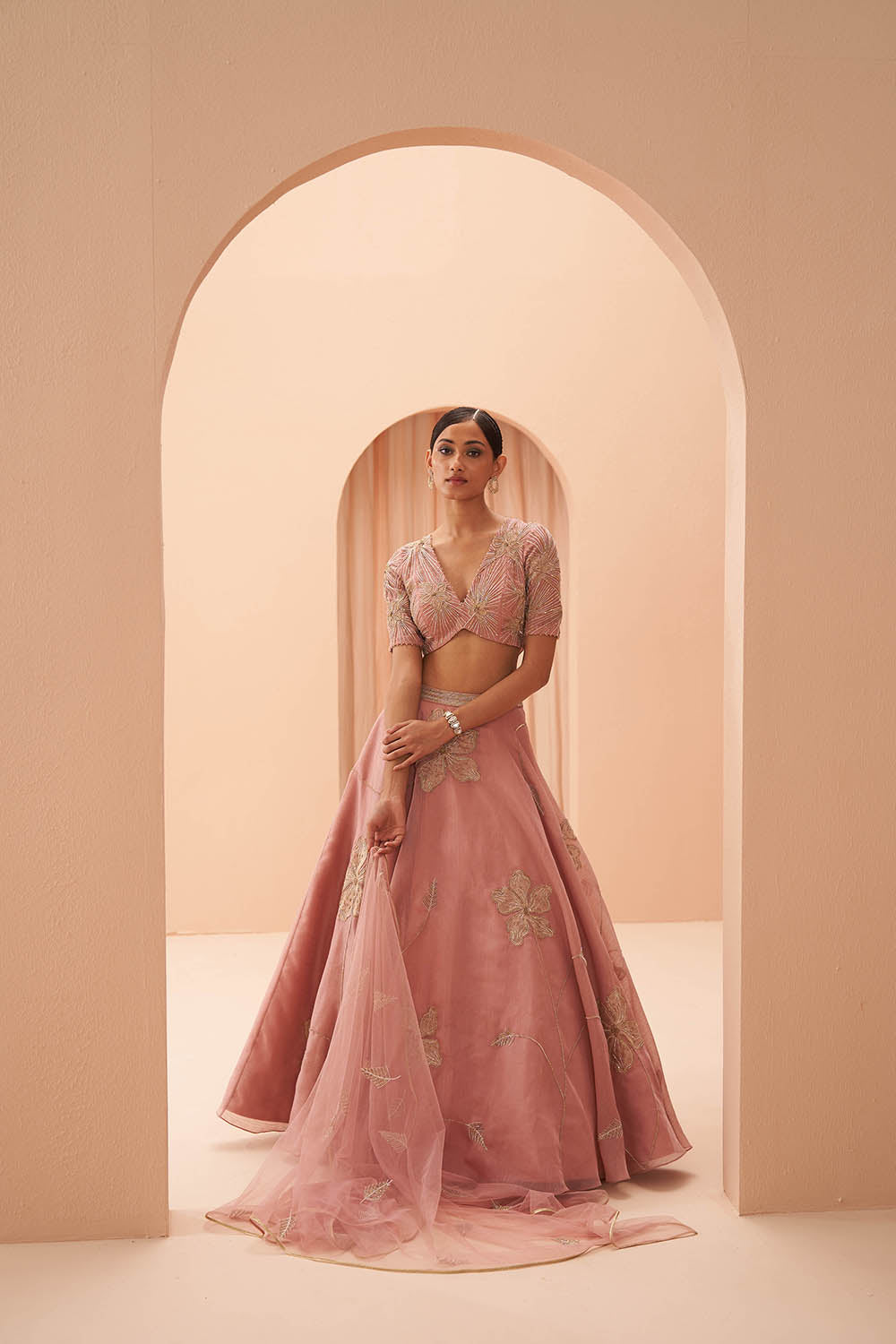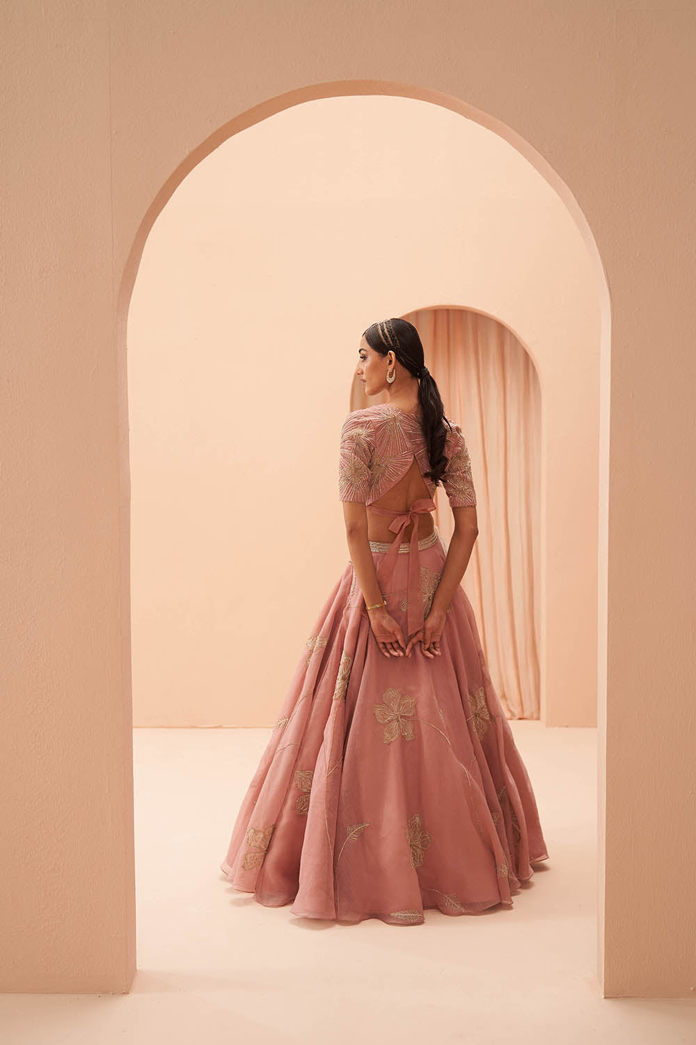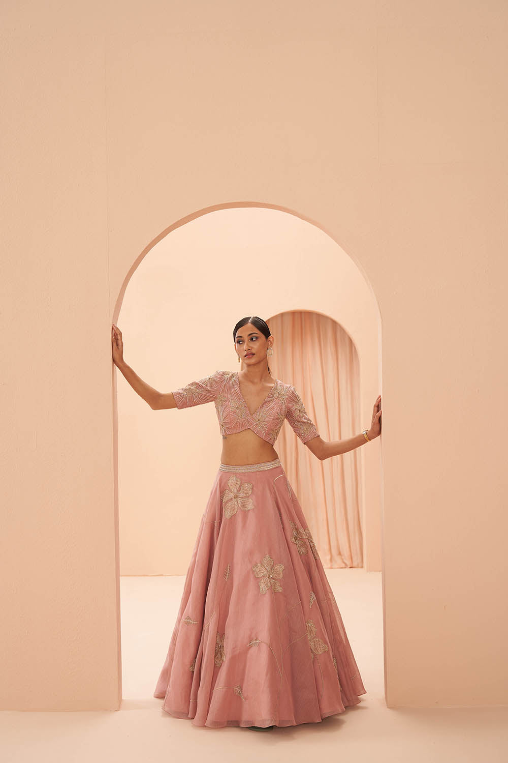 A beautiful soft pink lehenga adorned with organza flower applique all over.