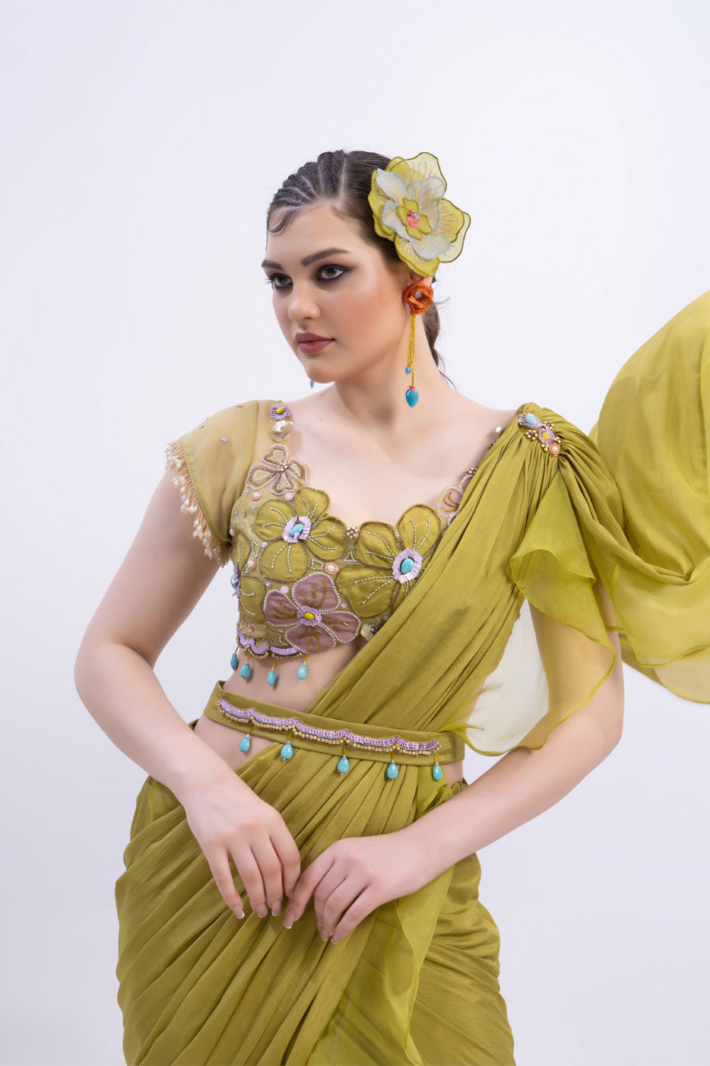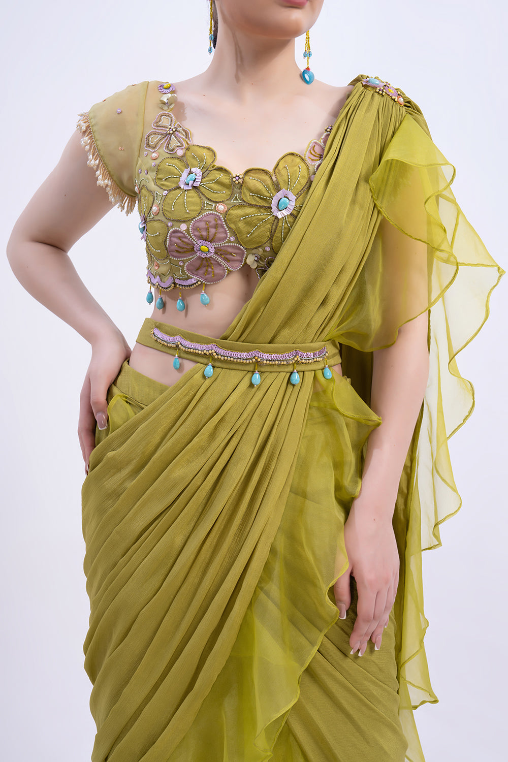 Lime Green Ruffle saree in Chiffon fabric comes with Blouse and a detachable pallu.