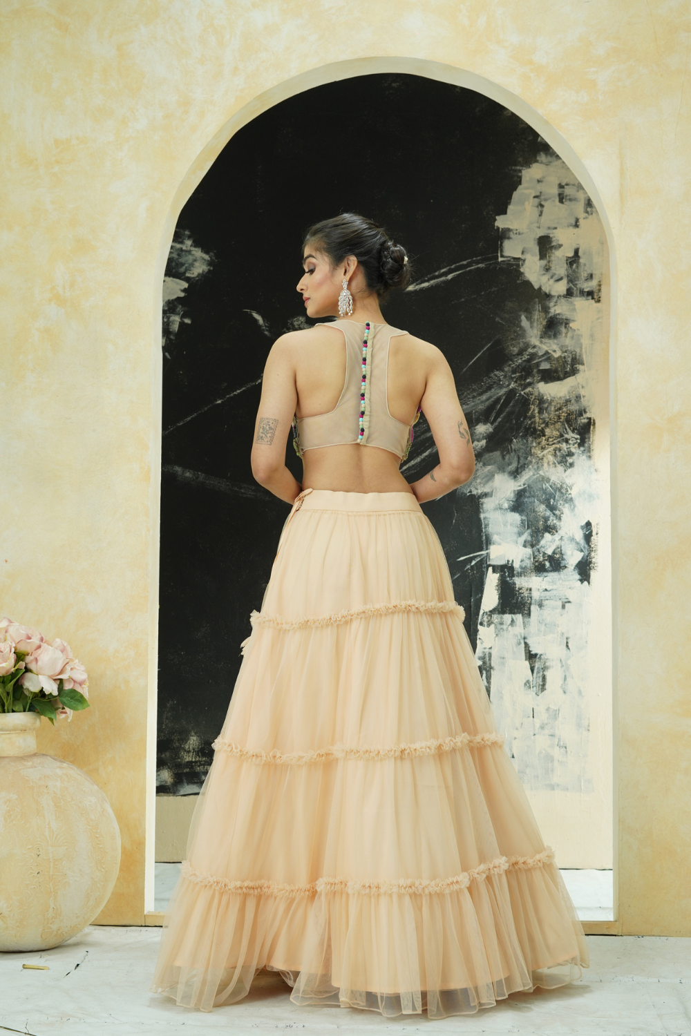 Multicolour hand embroidered blouse with Beige tier and ruffle skirt and dupatta.