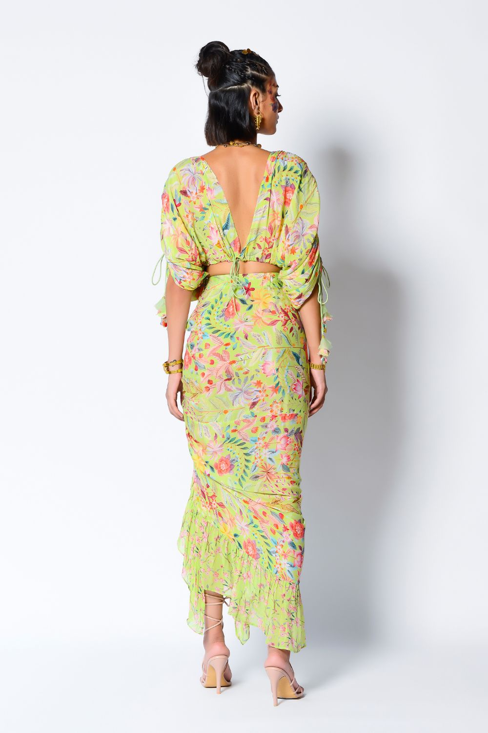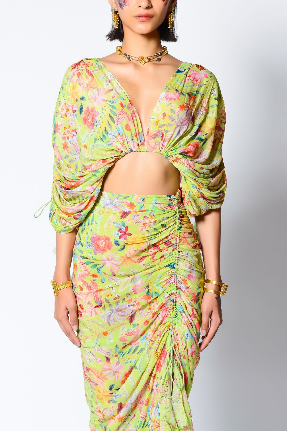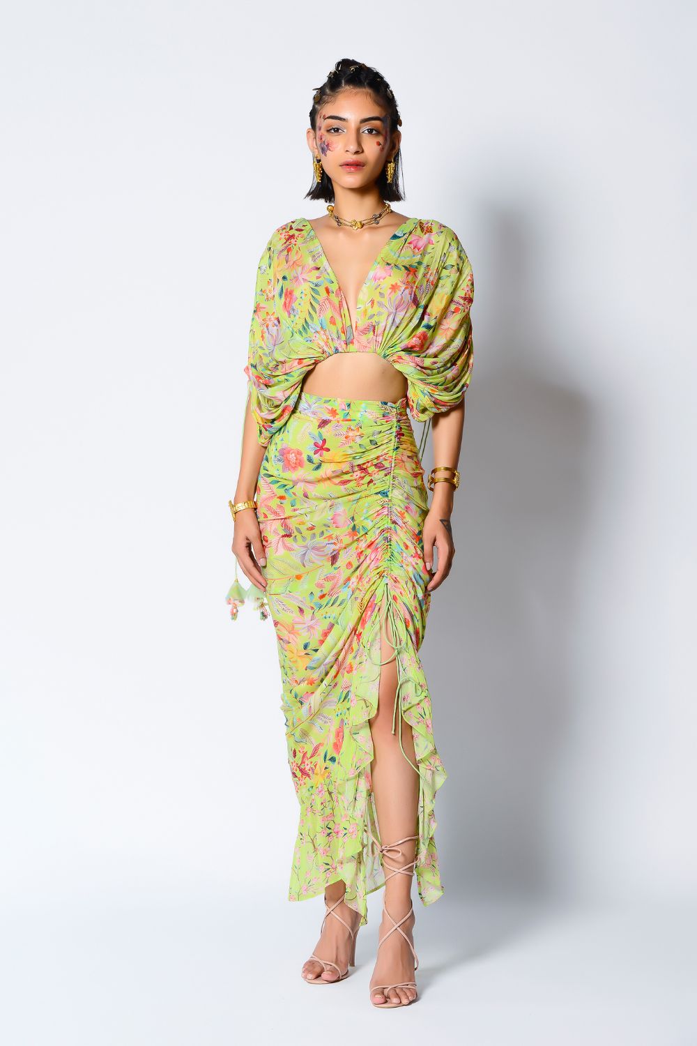 Featuring a Drape skirt with a slit teamed up with loose stretched Draped Top elasticised at the sleeve .