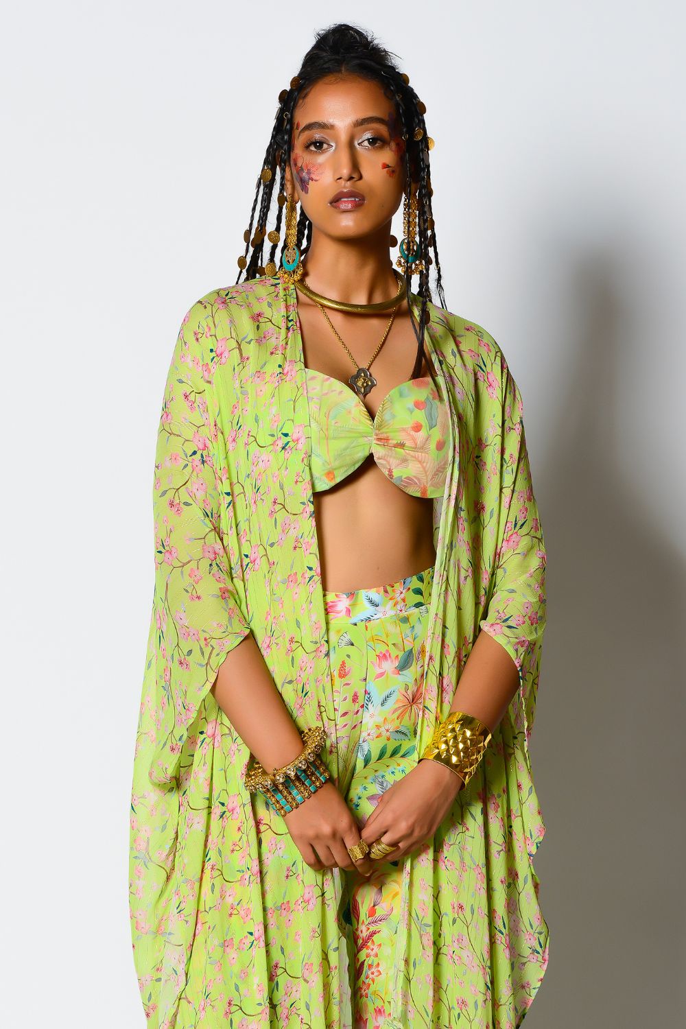 Featuring a loose georgette , gathered hem line cape , teamed up with the signature printed brallet paired with Printed gharrara .
