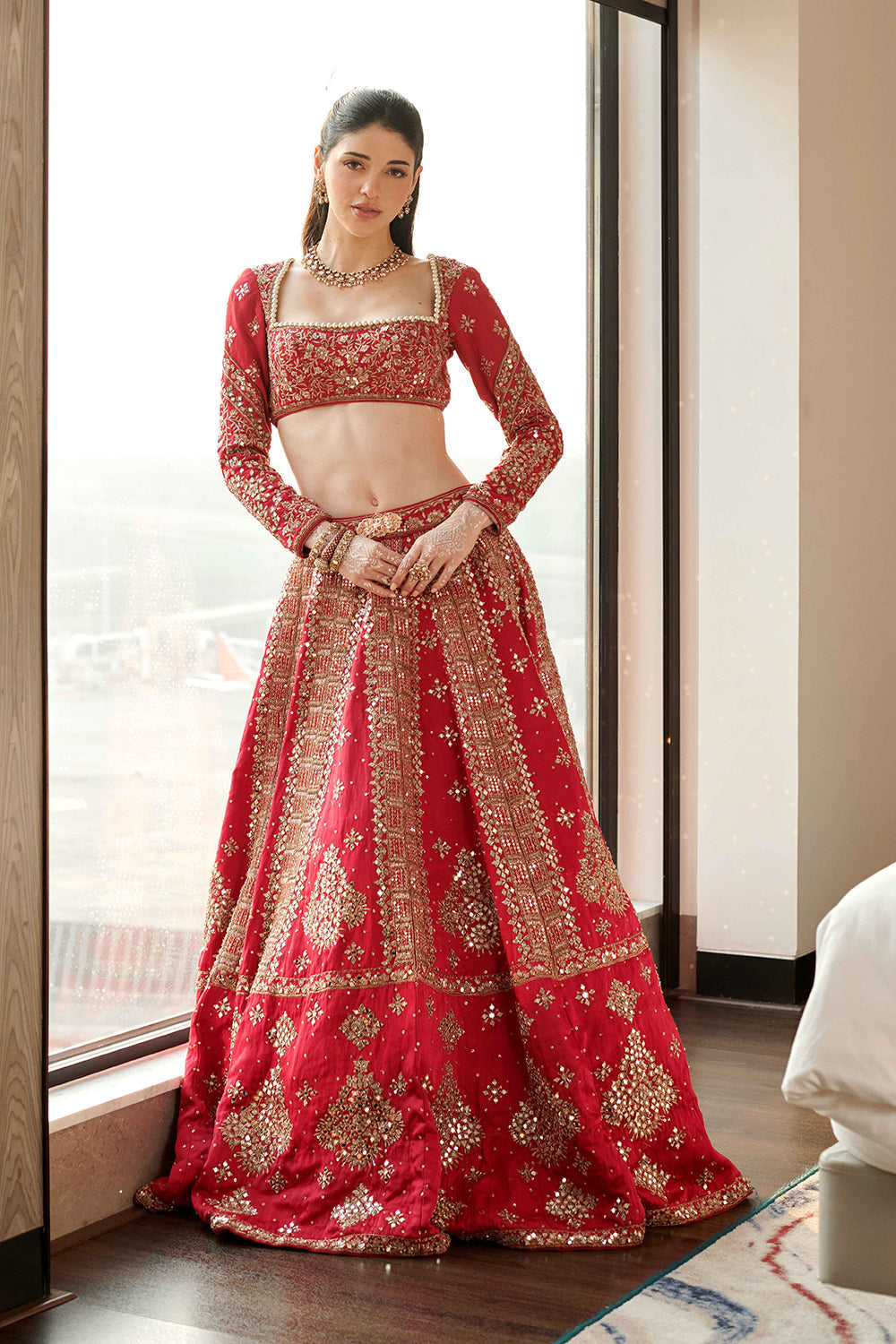 This stunning Raspberry Pink lehenga set is a perfect blend of tradition and elegance. The lehenga is crafted from luxurious Habutai Silk, adorned with intricate gold zari, mirror work, sequins, and cutdana, making it a true statement piece. The matching blouse, also made from Habutai Silk, features a full-sleeve design with a square neckline, beautifully embellished with pearls for a touch of refinement. The net dupatta is a masterpiece, decorated with the same embroidery as the lehenga and blouse along the borders, while delicate buttis embellish the rest. Handcrafted with intricate embroidery, this outfit radiates timeless beauty and sophistication, ideal for any festive or wedding occasion.