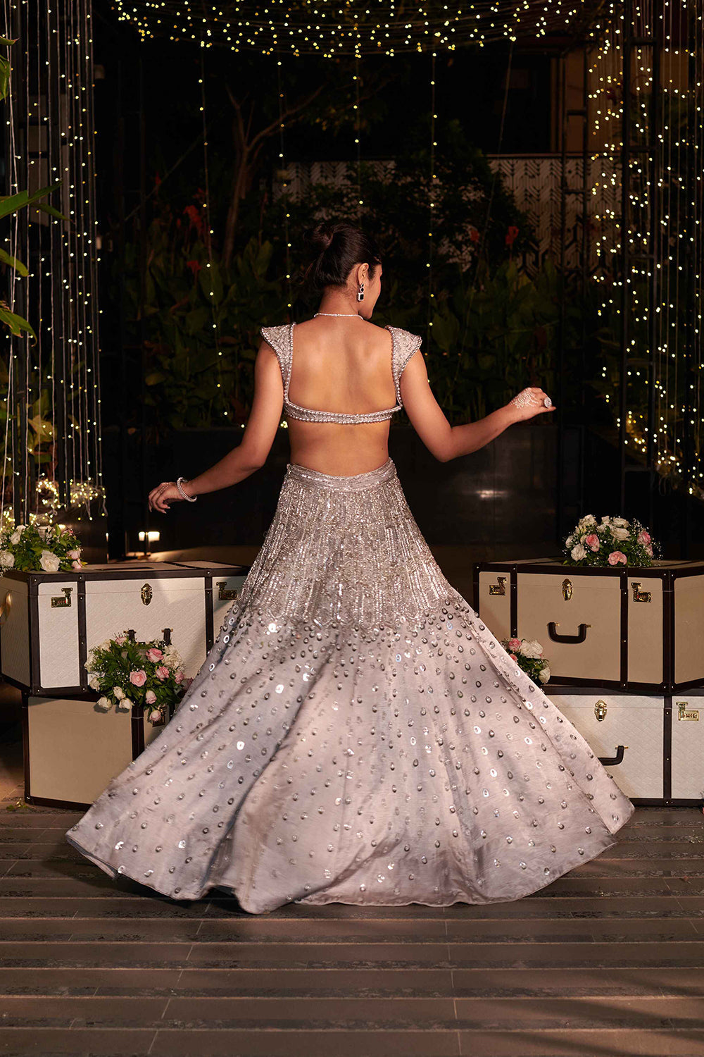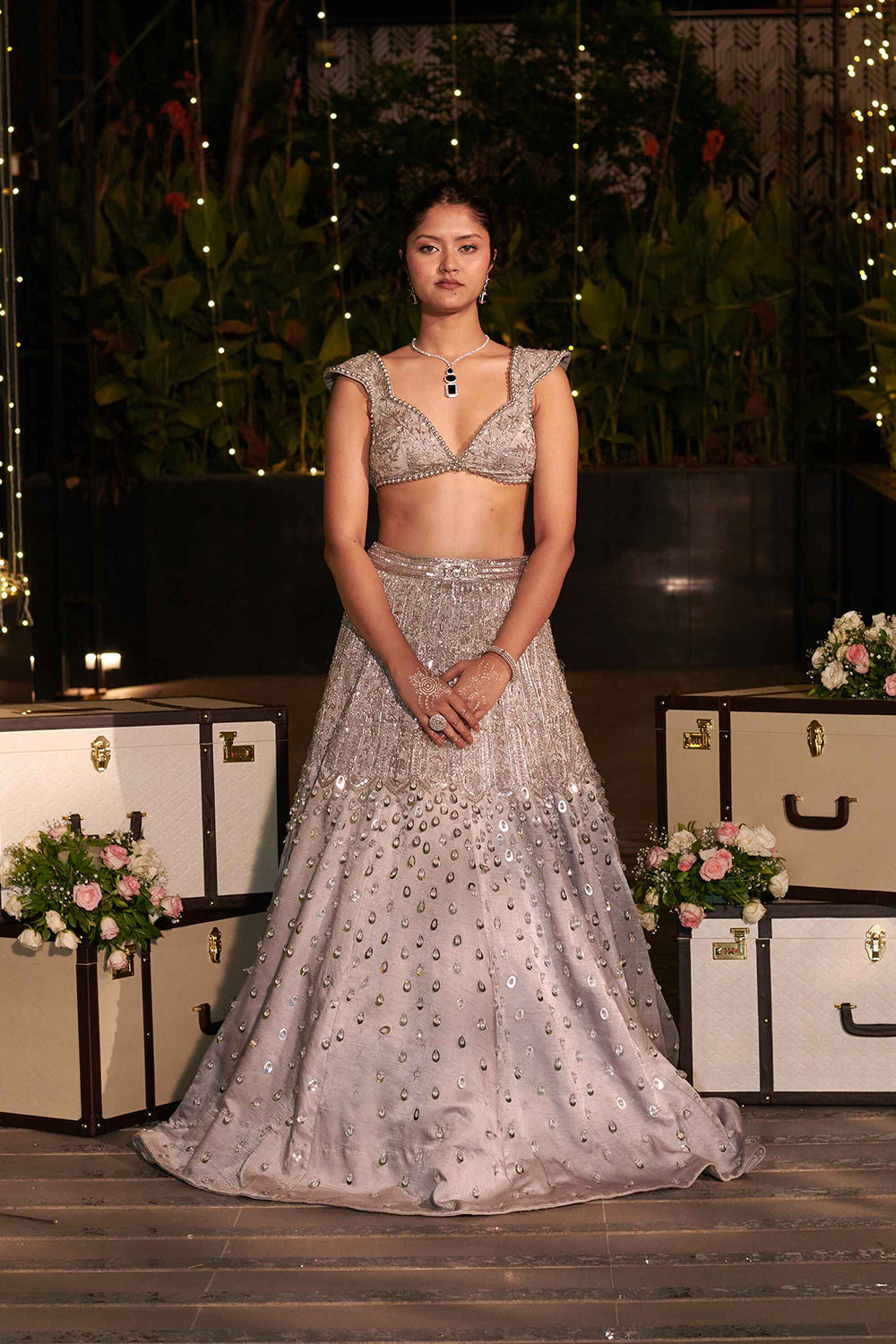 This exquisite women's ensemble in ash grey is crafted from luxurious Habutai silk, offering an elegant blend of tradition and contemporary design. The sleeveless blouse is a masterpiece, adorned with intricate silver handwork featuring sequin, cutdana, and zari, delicately embellished with silver pearls for added glamour. Paired with a stunning lehenga, the garment features intricate, heavy handwork that cascades from the waist to the thighs, while delicate silver leaves and crystals create a mesmerizing, shimmering effect. The ensemble is completed with a graceful net dupatta, adding a soft, ethereal touch to the look. Perfect for weddings or grand occasions, this outfit radiates opulence and sophistication, ensuring you stand out with timeless beauty.