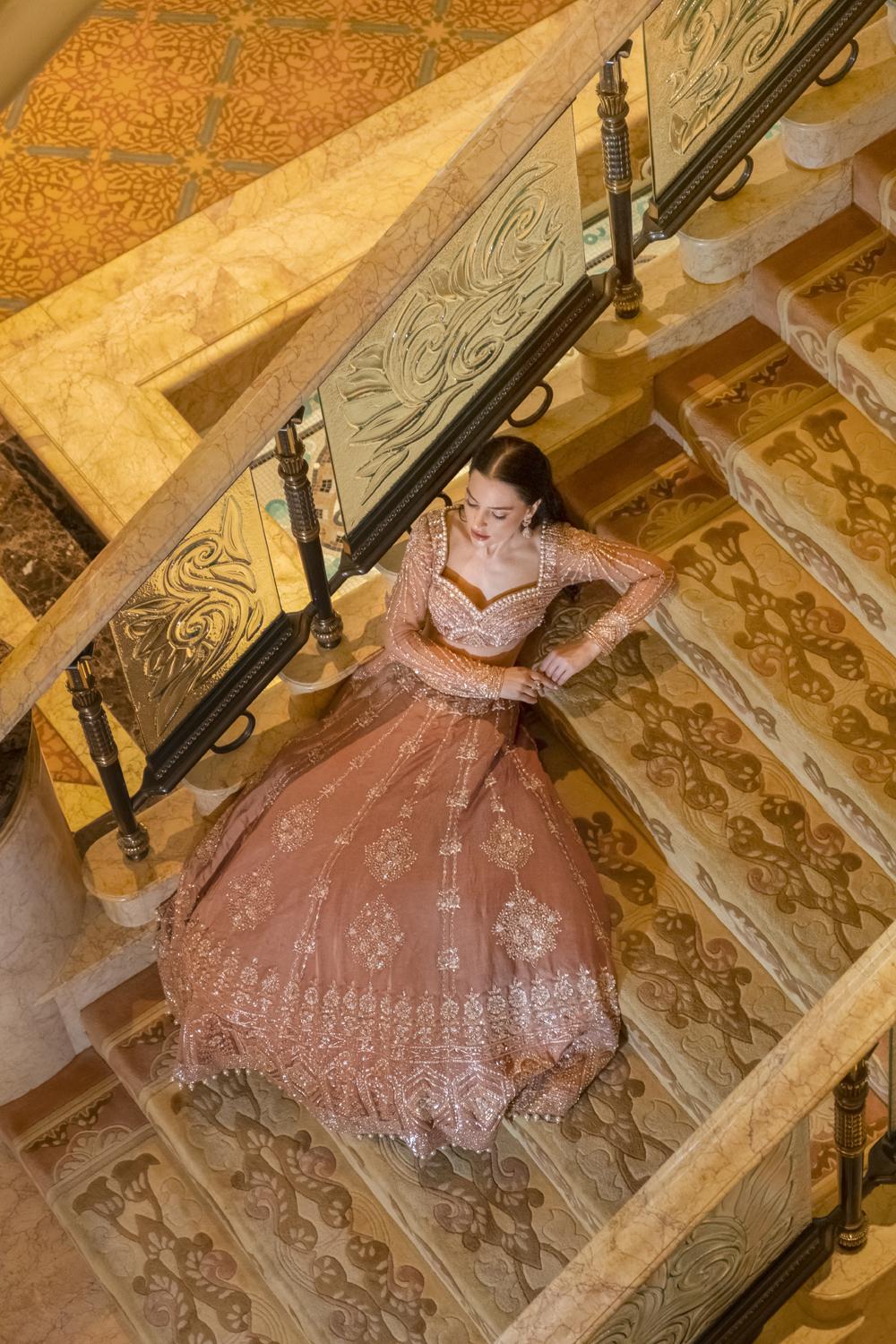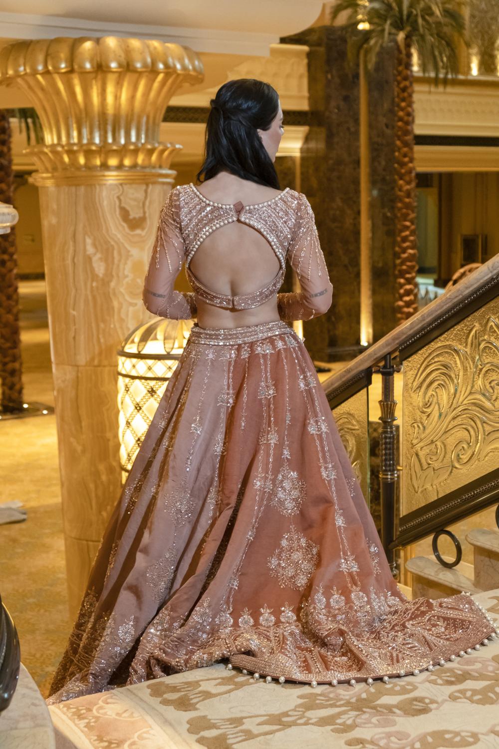 hazel brew brown lehenga set: exquisite lehenga set in captivating peru brown, a rich, earthy hue that enhances any occasion. the lehenga is crafted from luxurious habutai silk, offering a graceful drape and a soft sheen. paired with a matching habutai and net blouse, the ensemble features intricate net sleeves adorned with delicate handwork, adding a touch of artisanal charm. the dupatta, made entirely of fine net, flows elegantly and complements the ensemble’s sophisticated aesthetic. this lehenga set is a perfect blend of traditional craftsmanship and modern elegance