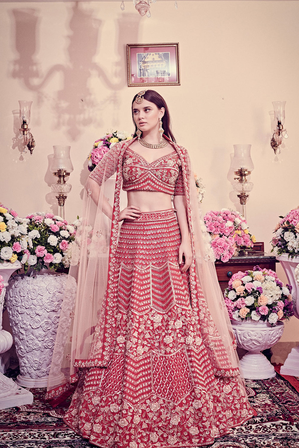The lady eugenia belousora wears a cranberry red floral silk base with highlights of french knots and sequins embroidery on lehenga, paired with detailed deep neck blouse to signify the new age bride.