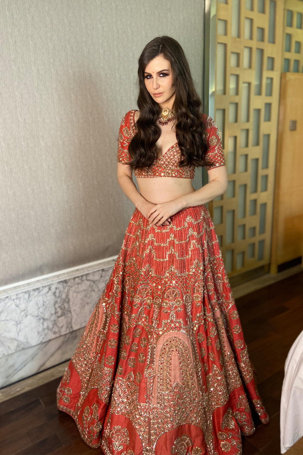 This scarlet red raw silk lehenga is a symbol of heritage and style. vibrant hues come alive in this ensemble making it the perfect choice for your wedding occasion. the lehenga is accentuated by using light gold dabka meticulously embroidered with ornamentation and thread work inspired by antique pichhwai art. the skirt is adorned with kalis blemished alternatively with textured raw silk patchwork giving a neo- classical essence to the whole look!