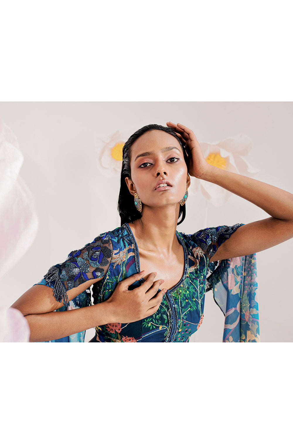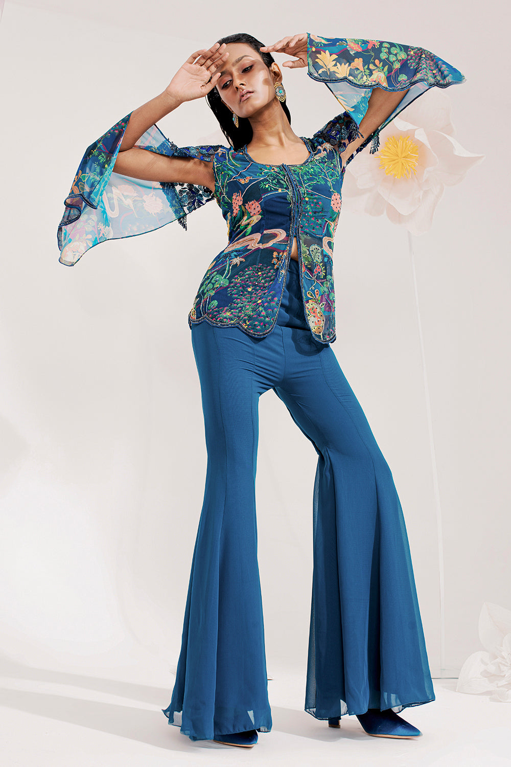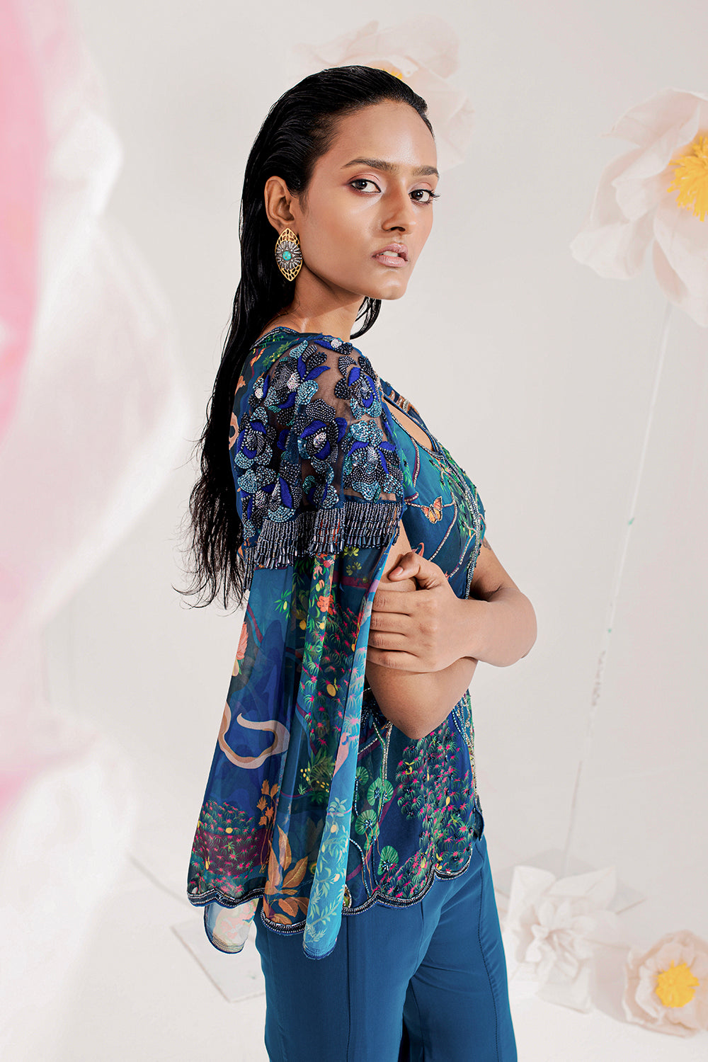 The ensemble features our signature Gulposh print, beautifully displayed on a flowy cape top crafted from luxurious georgette fabric. The cape top is hand-highlighted with delicate embroidery and adorned with hand-embroidered tassel details, adding artisanal charm to the look. The cape’s sleeves are intricately enriched with zardozi, sequins, and katdana work. The teal blue color palette exudes sophistication and pairs effortlessly with the wide-legged pants, which provide a flattering and elongating fit. The coord set merges comfort with luxury, making it ideal for festive occasions, cocktail parties, or high-end events. Fabric: Georgette, ensuring lightweight comfort and a flowy, ethereal silhouette.
