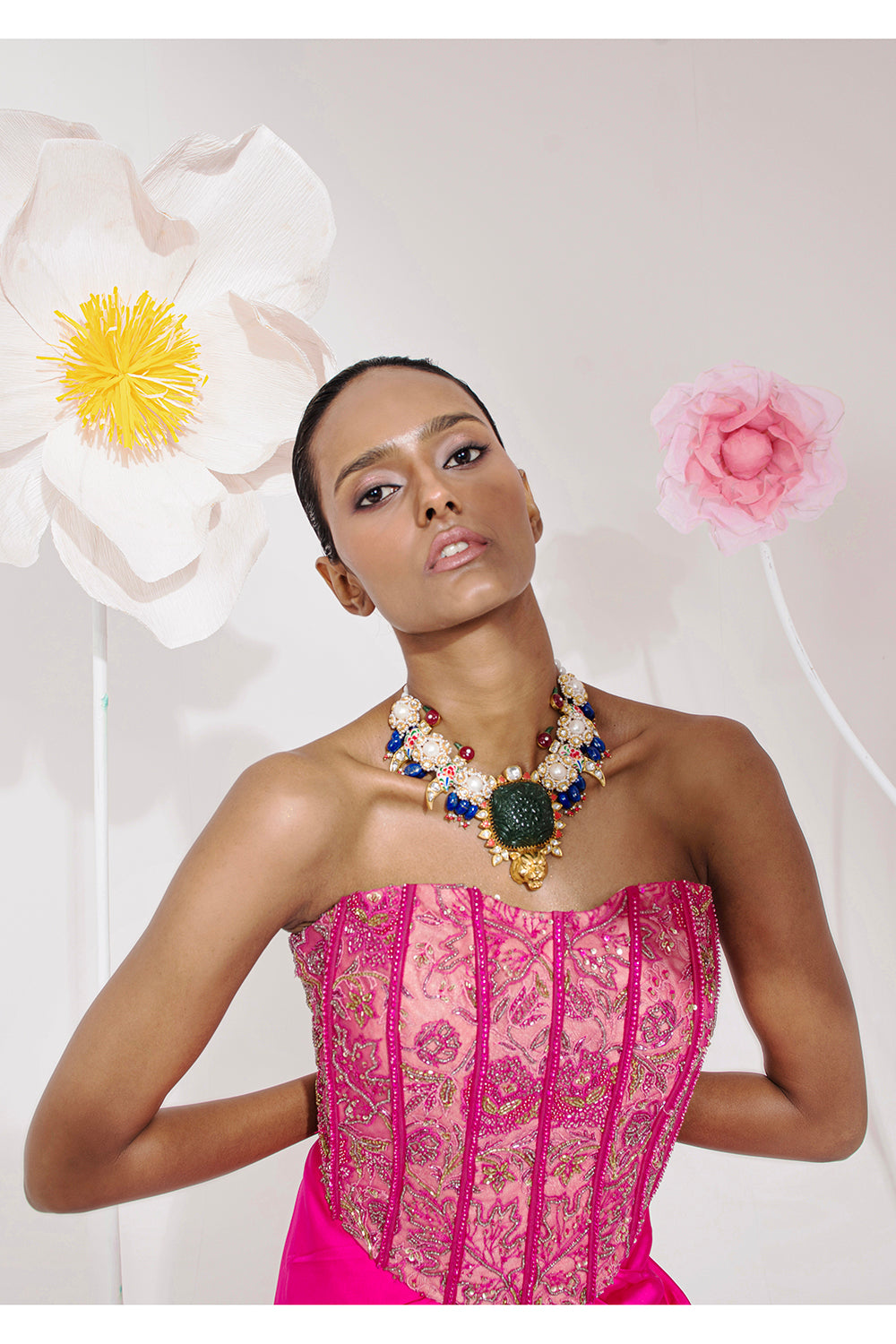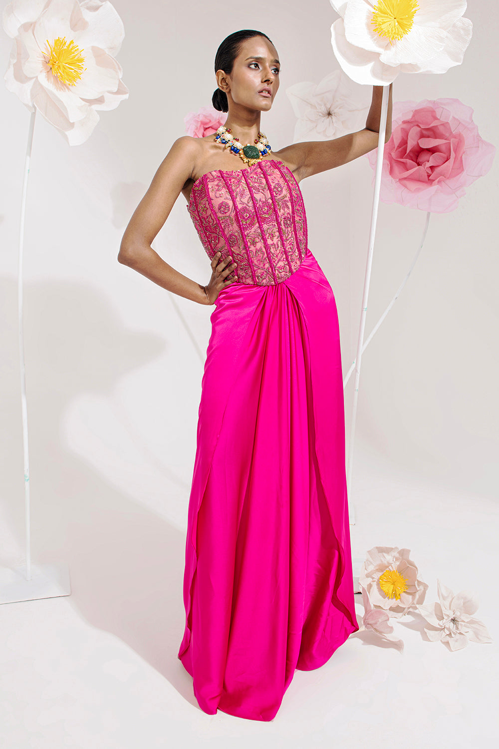 The Hoor ensemble, inspired by the delicate beauty of wildflowers, presents an elegant blend of modern refinement and timeless charm. The set features a corset and draped skirt, designed to highlight intricate craftsmanship and grace. The corset is crafted from luxurious satin, providing a smooth, polished surface that drapes beautifully on the body. It is adorned with exquisite hand embroidery, incorporating floral motifs reminiscent of blooming wildflowers. The embroidery techniques used on the corset are a fusion of intricate threadwork, delicate bead embellishments, and subtle sequin accents, all designed to add depth and texture to the piece. The vibrant fuchsia pink hue of the fabric adds a bold yet sophisticated touch, making it a statement piece. The corset is paired with a graceful draped skirt, crafted from a combination of satin and fine net. The soft, flowing fabric of the skirt contrasts with the structured corset, creating a harmonious balance between strength and femininity. The net overlay adds a layer of delicacy and movement to the design, allowing for a fluid, ethereal feel as the wearer moves.