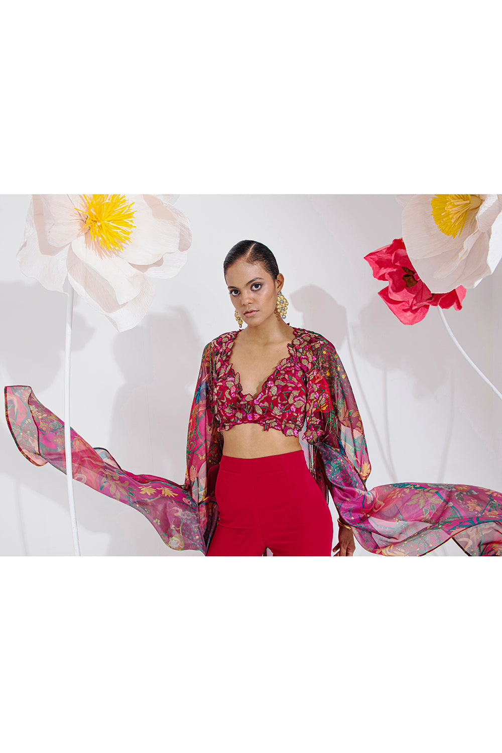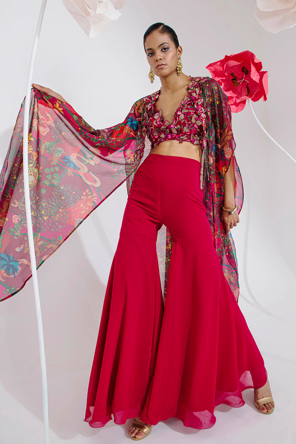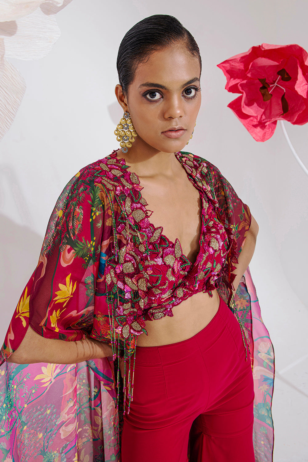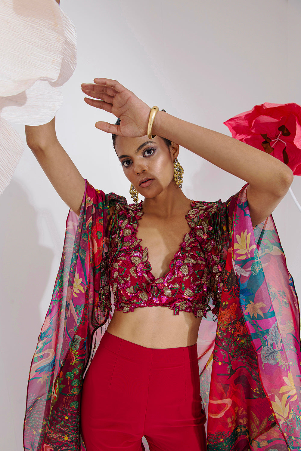 The Rasia features a fuss-free silhouette that flatters the figure, allowing for comfortable movement while making a bold statement. The vibrant rose red color radiates warmth and confidence, making it suitable for a variety of occasions, from casual gatherings to festive celebrations. Crafted from a luxurious blend of georgette and satin, the Rasia drapes beautifully, offering a lightweight feel without compromising on style. The georgette adds a soft, flowy element, while the satin introduces a subtle sheen that elevates the overall aesthetic, ensuring you look polished and chic. The standout feature of the Rasia is its lively signature print, which infuses the ensemble with dynamic energy. This bold print is complemented by exquisite embroidery that showcases intricate artistry, capturing the essence of modern elegance while remaining timeless. Adding a touch of whimsy, the Rasia is adorned with playful tassels that sway with your movements. These charming accents enhance the garment’s appeal, ensuring you remain the center of attention whether you're dancing at a celebration or mingling at an event. pieces in your wardrobe for a unique twist.