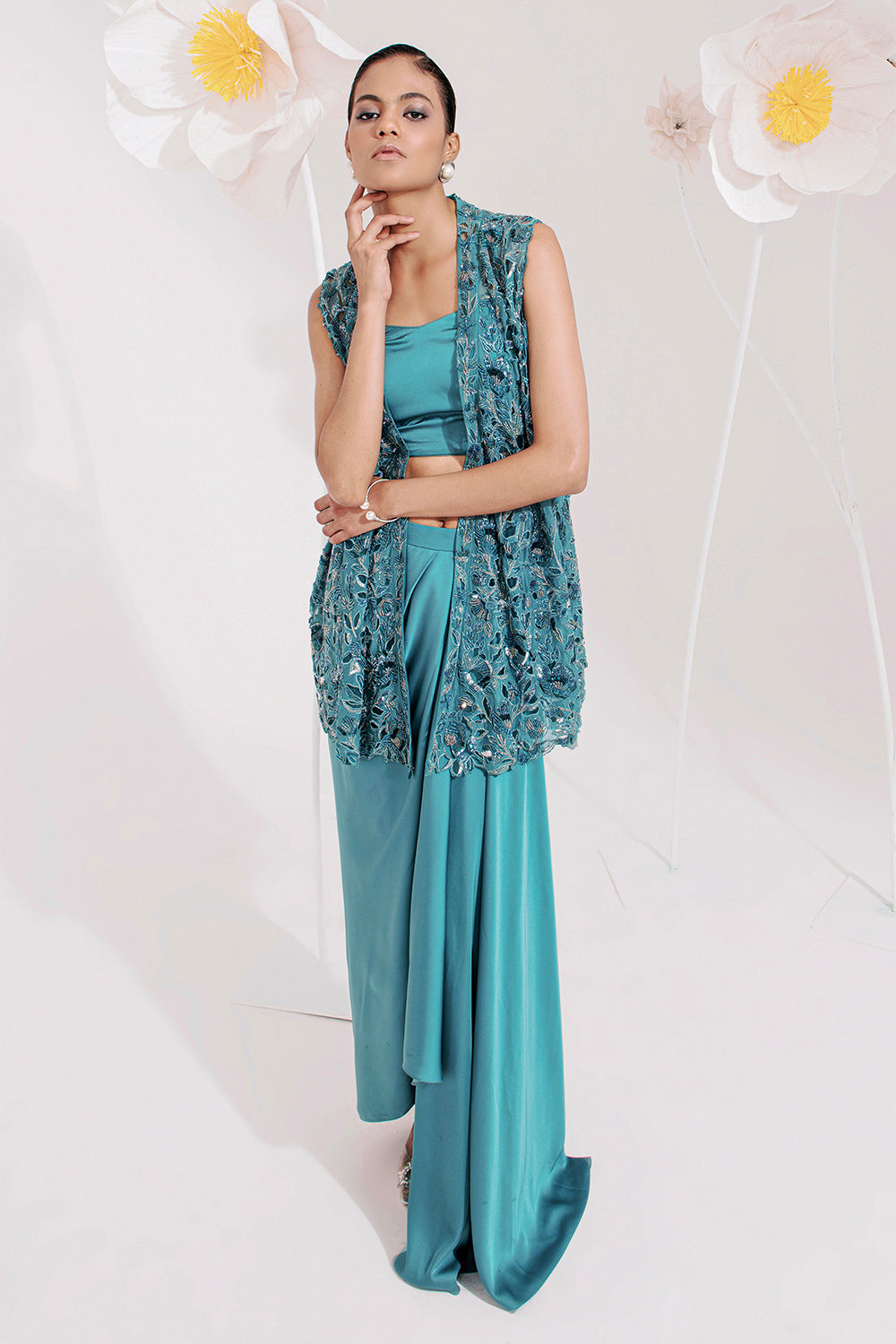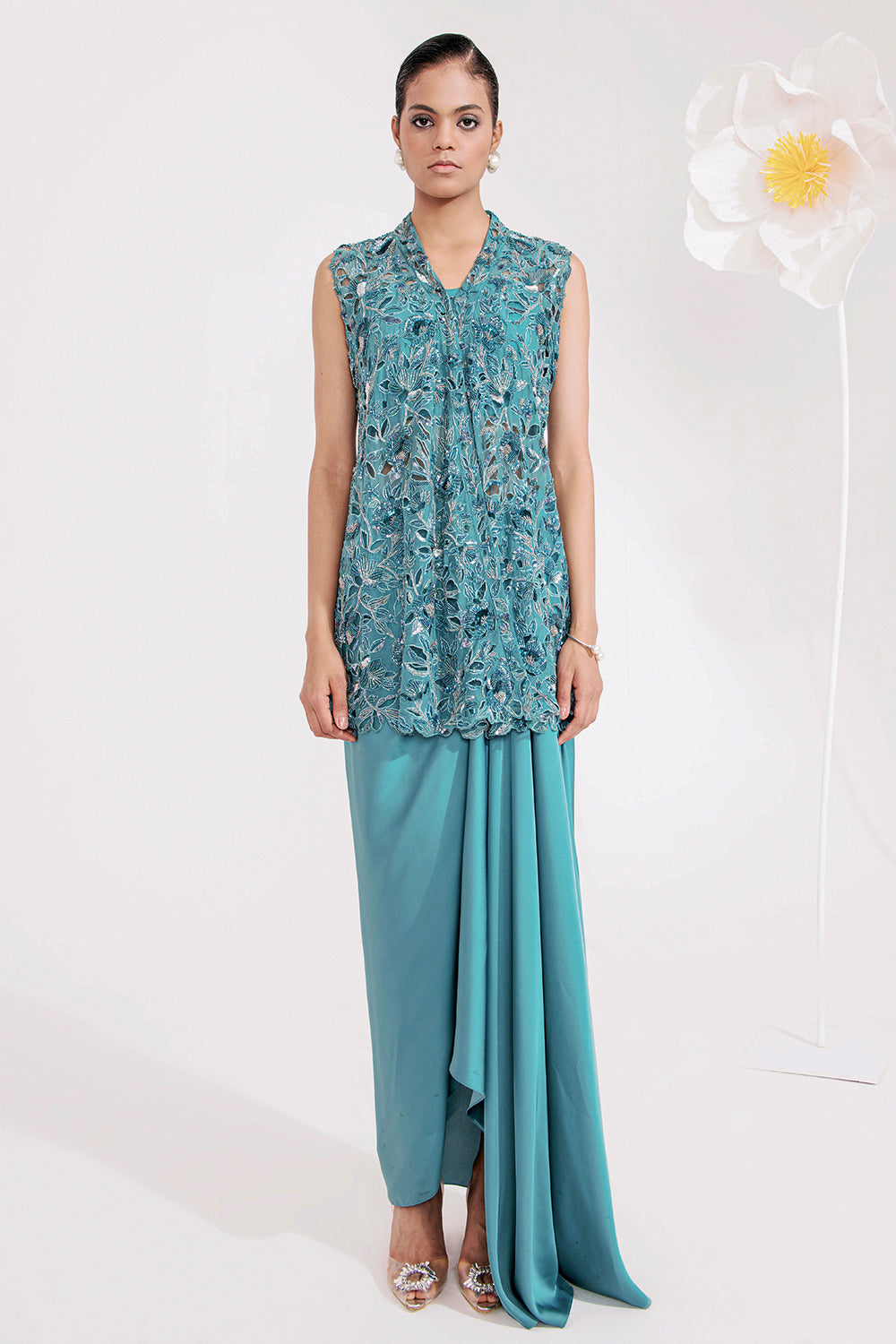 The Zarah ensemble strikes a perfect balance between modesty and high fashion. The tailored jacket showcases intricate cutwork embroidery, creating a visually captivating look that draws the eye. The flowy skirt drapes elegantly, while the bustier adds a contemporary twist, allowing for a flattering silhouette that enhances your natural beauty. Crafted from a luxurious blend of organza and satin, the Zarah ensemble offers both comfort and sophistication. The lightweight organza provides a delicate, airy feel, while the satin lends a rich sheen, making this piece suitable for both day and evening events. The soft aqua blue hue adds a refreshing touch, evoking a sense of tranquility and elegance. This versatile color can easily be accessorized to create various looks, making it a staple for any occasion. Perfect for weddings, receptions, or formal gatherings, the Zarah ensemble can be styled with statement jewelry and elegant heels for a complete look. Its timeless design ensures it remains a cherished piece in your wardrobe for years to come.