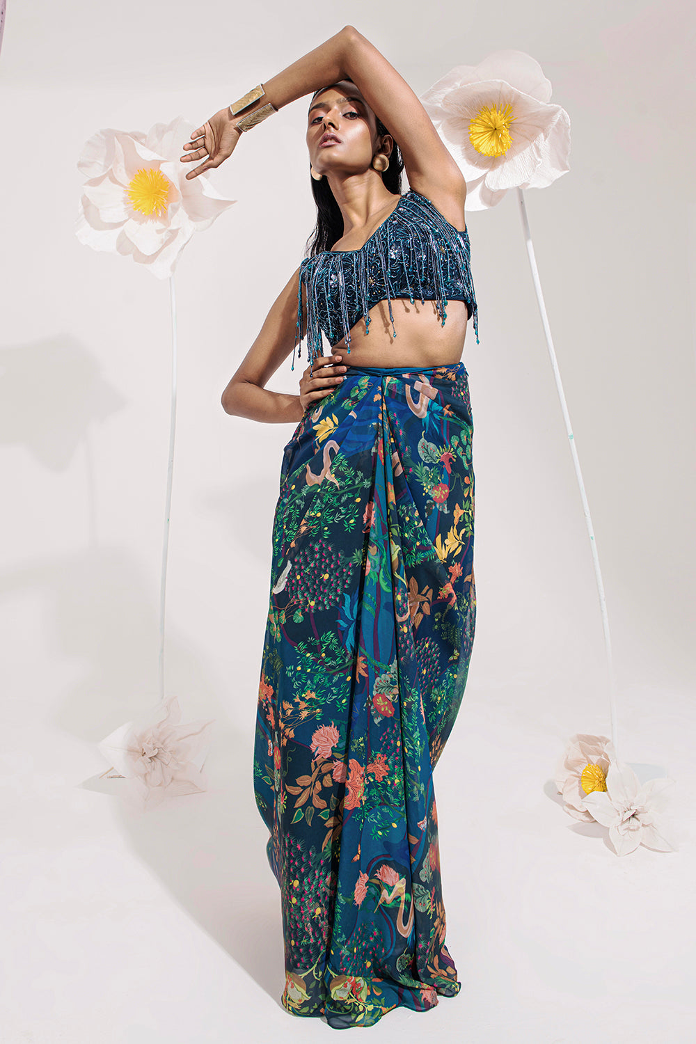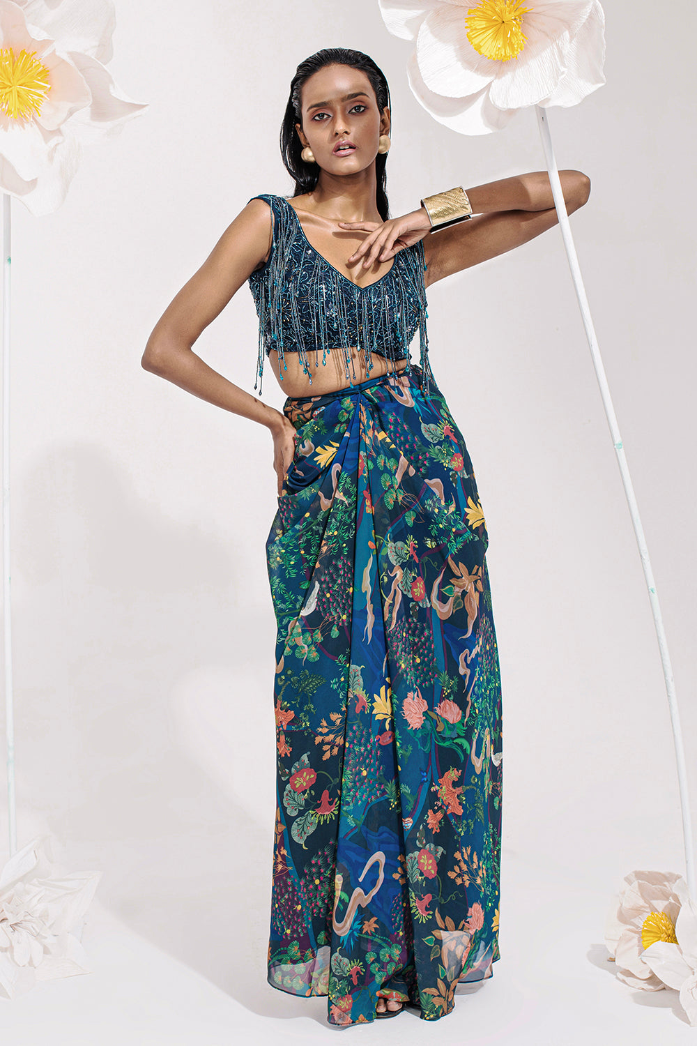 The Alana features a beautifully draped skirt that flows gracefully, creating a stunning silhouette that flatters a variety of body types. The vibrant teal blue color enhances the garment's lively spirit, making it a versatile choice for both daytime events and evening celebrations. Made from a luxurious blend of net and georgette, the Alana set offers a lightweight and breathable feel. The delicate net adds a touch of ethereal beauty, while the georgette ensures a soft drape, providing both comfort and style. Hand-Embroidered Blouse: At the heart of the ensemble is a hand-embroidered blouse, adorned with intricate tassel details that infuse the outfit with a playful touch. This exquisite craftsmanship elevates the overall design, ensuring you stand out at any gathering. Perfect for weddings, parties, or festive occasions, the Alana drape skirt set can be styled with statement accessories and elegant footwear for a complete look. Its charming combination of playful elements and sophisticated design makes it a must-have in your wardrobe.
