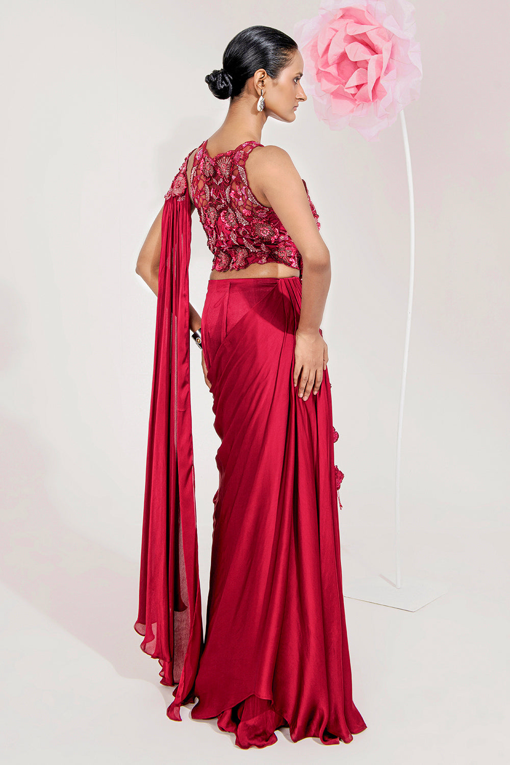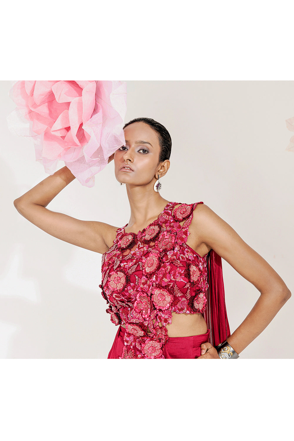 Step into the spotlight with the Ayka drape saree, a vibrant expression of fun and festivity that effortlessly blends traditional elegance with contemporary flair. This striking maroon saree is adorned with stunning 3D florals and playful tassel detailing, making it a captivating addition to your wardrobe. The Ayka drape saree features a beautifully flowing silhouette that enhances your figure, creating a sense of grace and movement. Its rich scarlet hue radiates warmth and confidence, ensuring you make a memorable impression at any event. Crafted from a luxurious blend of satin georgette and net, the Ayka saree drapes beautifully while offering a lightweight and comfortable feel. The satin georgette provides a soft sheen, while the net adds a delicate layer of texture, enhancing the overall elegance of the ensemble. What truly sets the Ayka apart is its intricate 3D embroidery and cutwork. The stunning floral embellishments add depth and dimension, bringing the saree to life and showcasing the artistry behind its design. The playful tassel detailing adds a whimsical touch, enhancing the saree's festive appeal.
