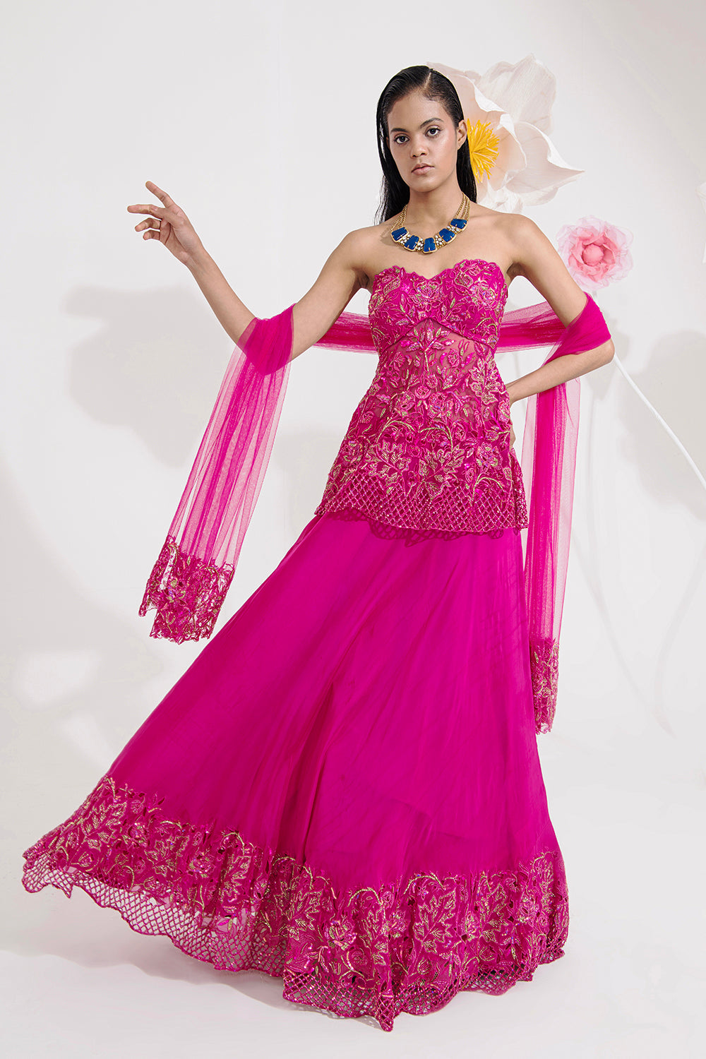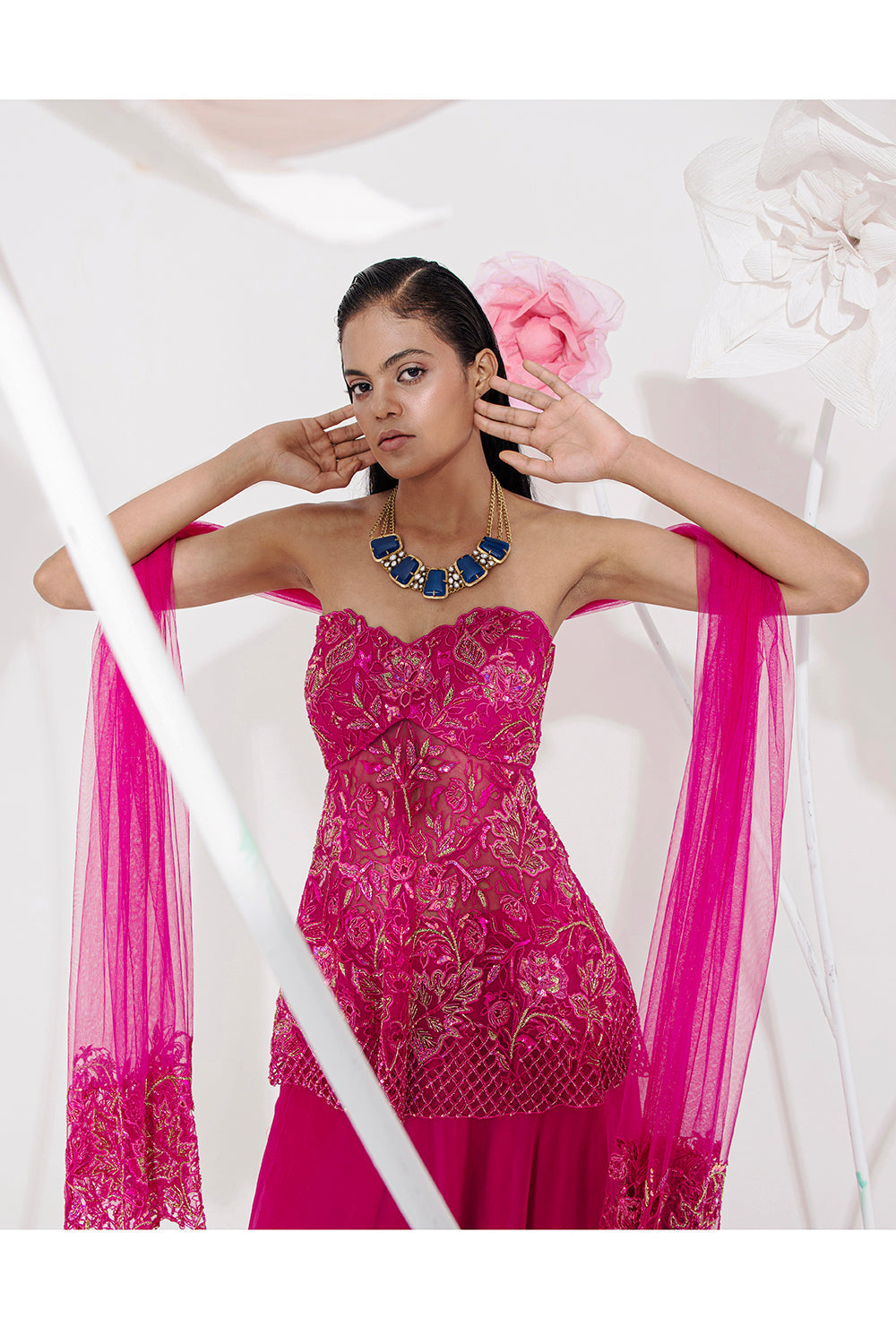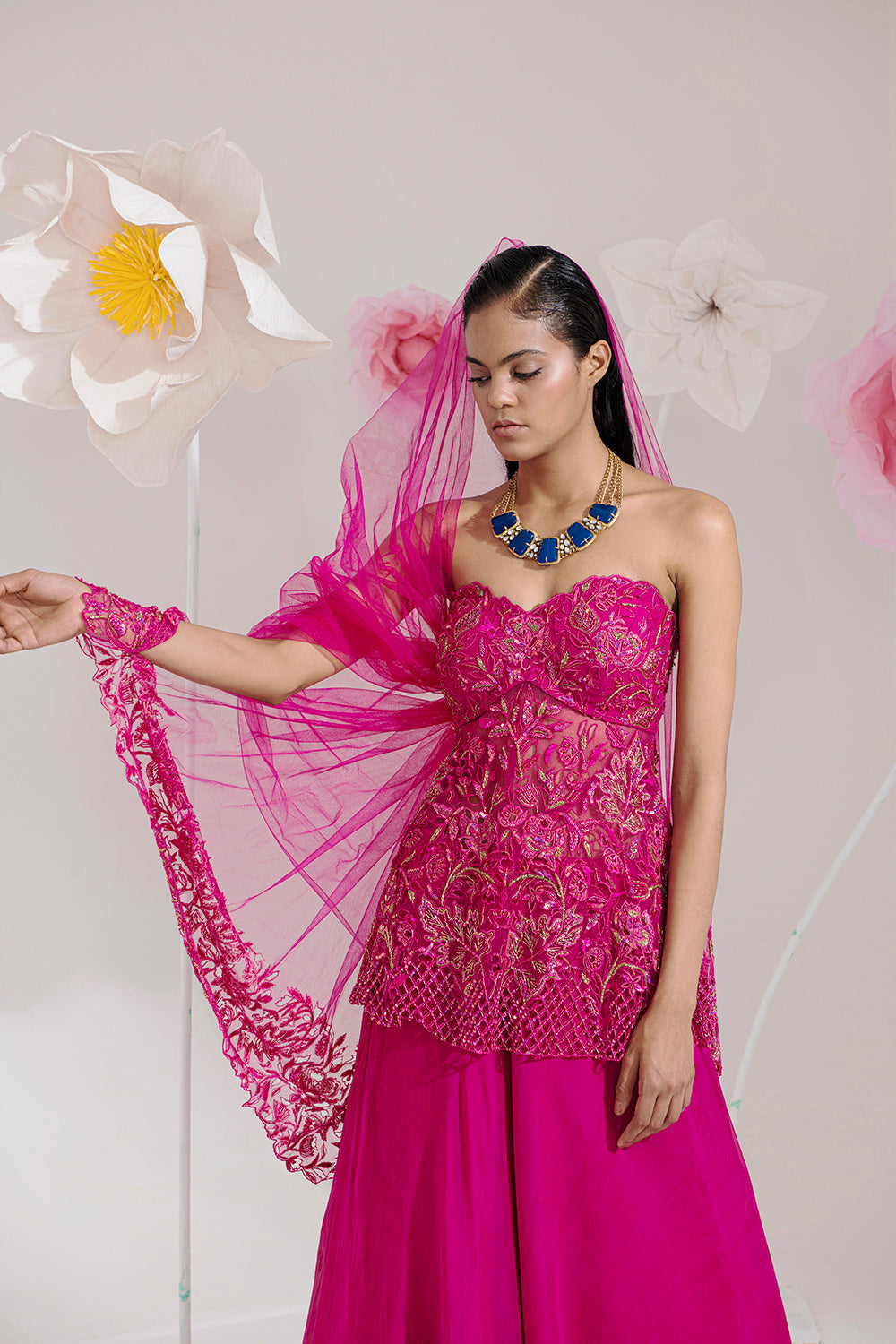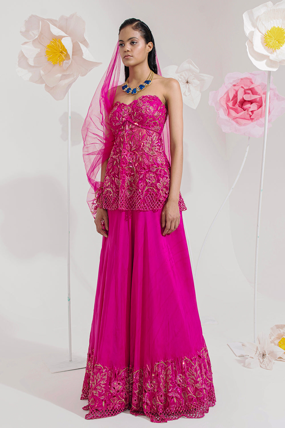This stunning peplum set, named Layla, is designed for the modern and bold woman who loves to make a statement. Featuring a vibrant fuchsia pink hue, the ensemble stands out with its flawless embroidery that adds a layer of sophistication and glamour. Crafted from a luxurious combination of organza and net, the peplum top is delicately embroidered, while the flowing, wide-legged bottoms maintain a clean, elegant look. Ideal for special occasions like weddings, this piece merges traditional charm with a contemporary edge, ensuring you make a lasting impression. Its peplum cut accentuates the waist, creating a flattering silhouette, while the intricate detailing and vibrant color ensure all eyes are on you. Whether it's worn at a reception or an evening event, Layla captures attention and showcases a refined yet bold sense of style.