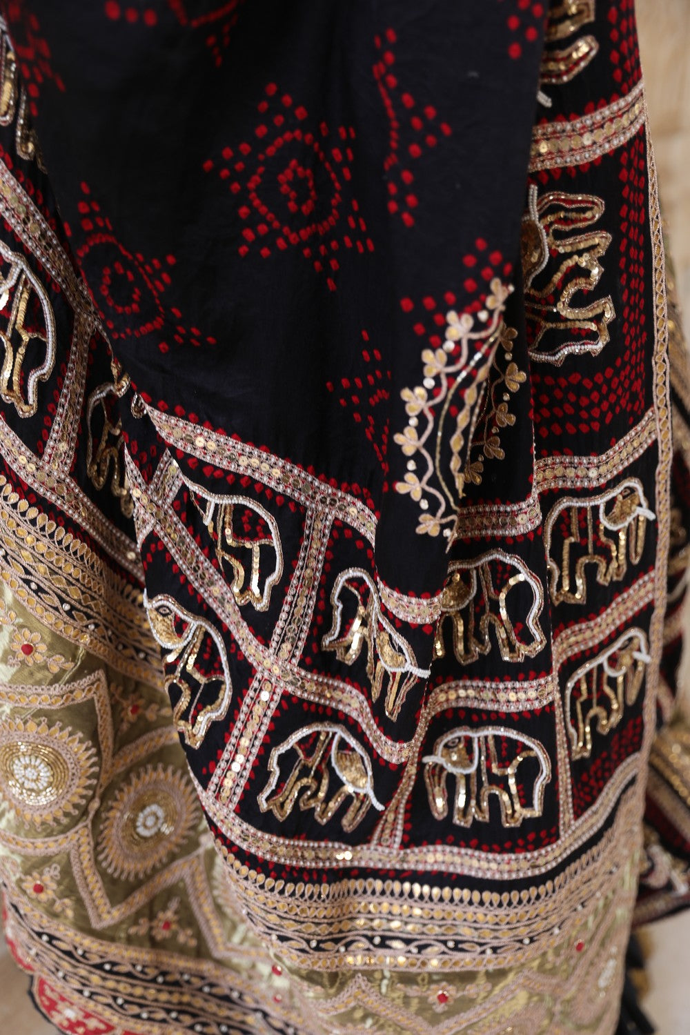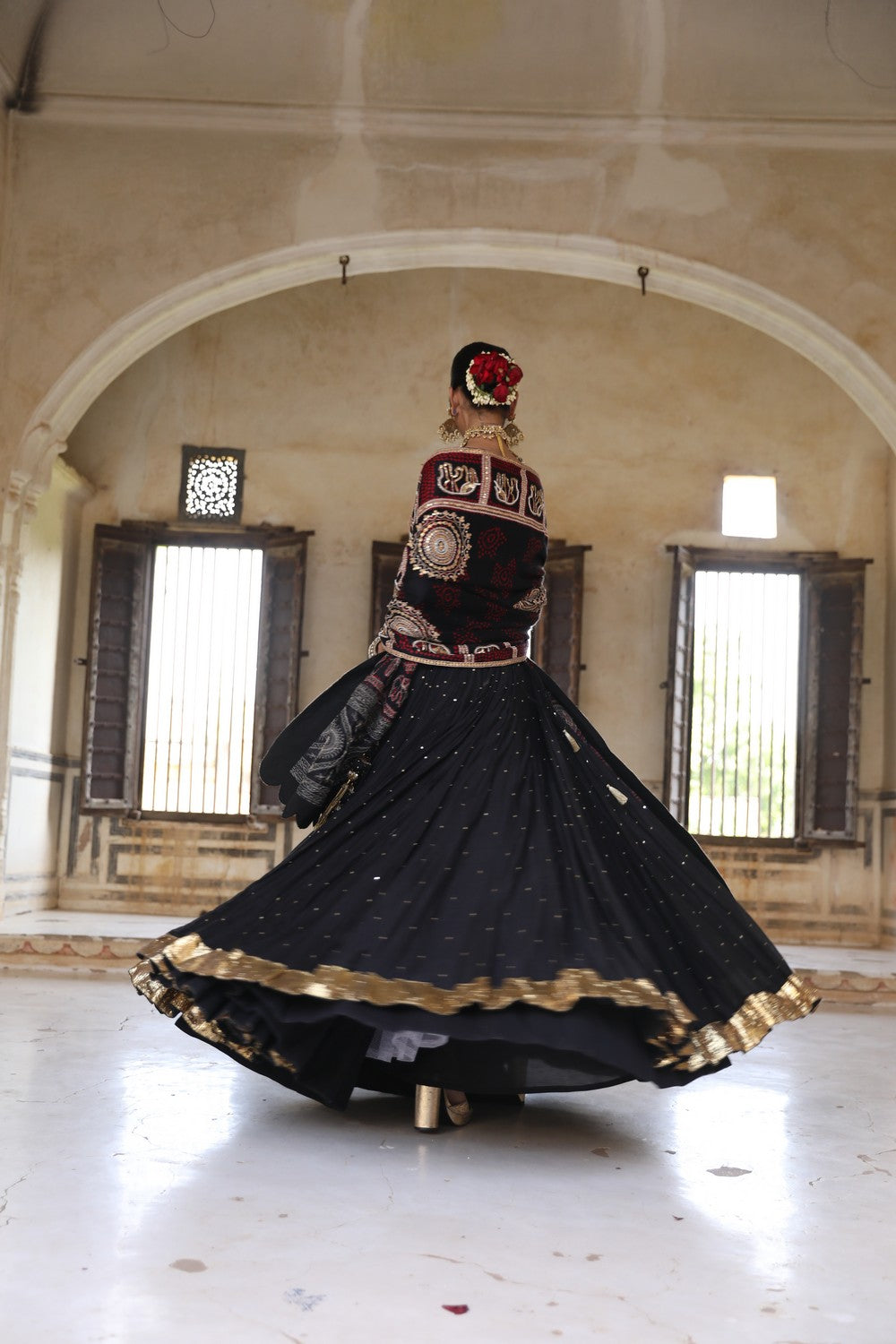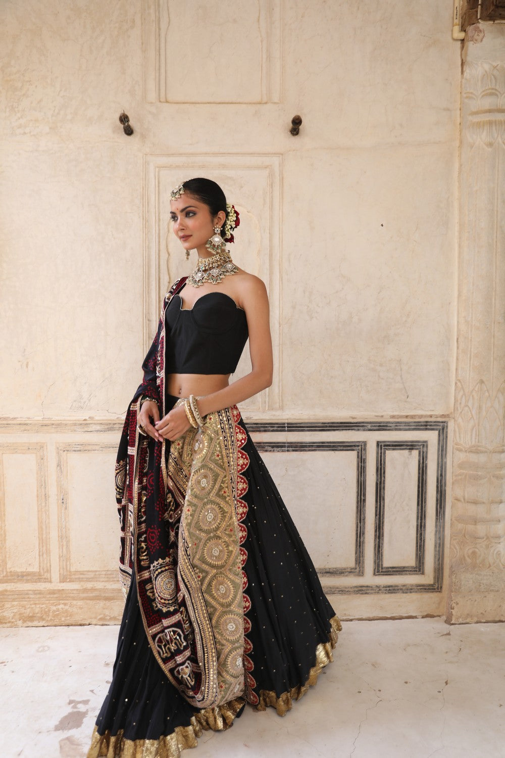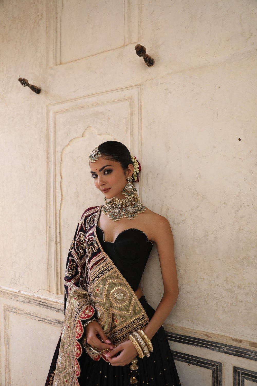 Turn heads with our Masha Lehenga Set, designed in luxurious black silk and lined with 100% cotton for ultimate comfort. This stunning ensemble is adorned with intricate zardosi hand embroidery, adding a touch of regal elegance. The set includes a 48-inch kali-style lehenga, a churidaar, and a 2.5-meter dupatta, making it an ideal choice for weddings and festive events.