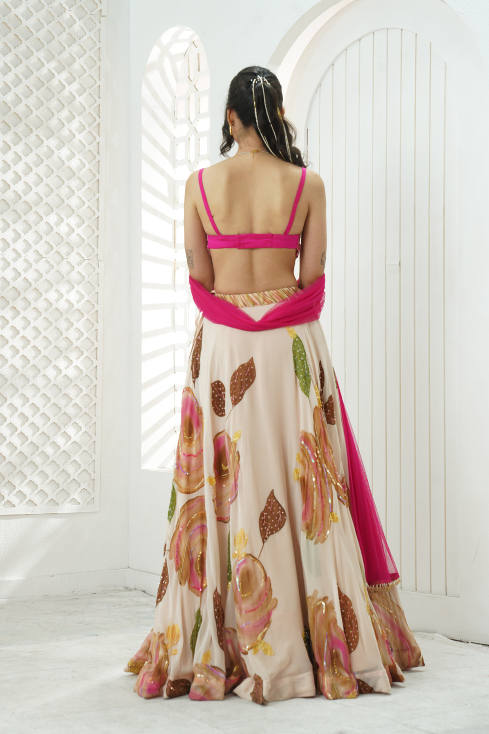 Baby pink georgette hand painted and hand embroidered lehenga with Fuchsia bralette in floral embroidery and dupatta set.