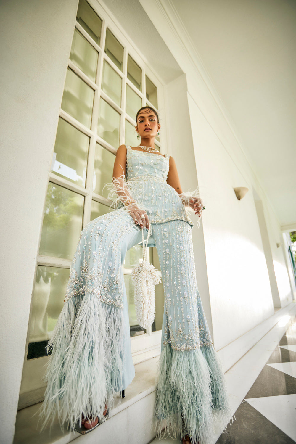 Celeste: celestial blue peplum & flairy feather palazzos set