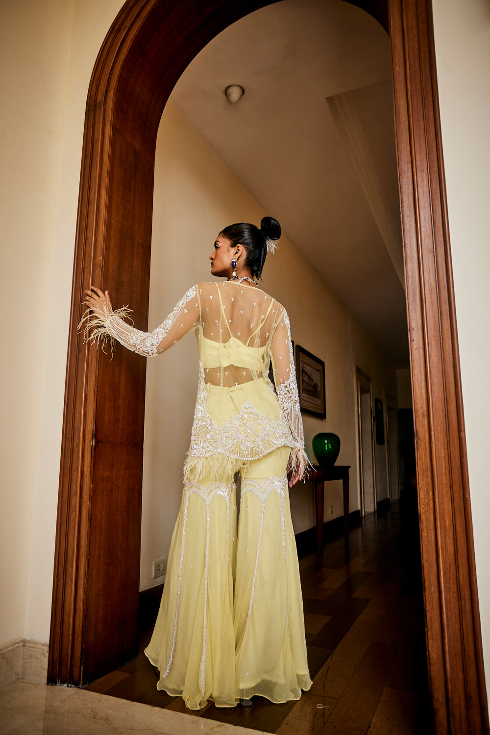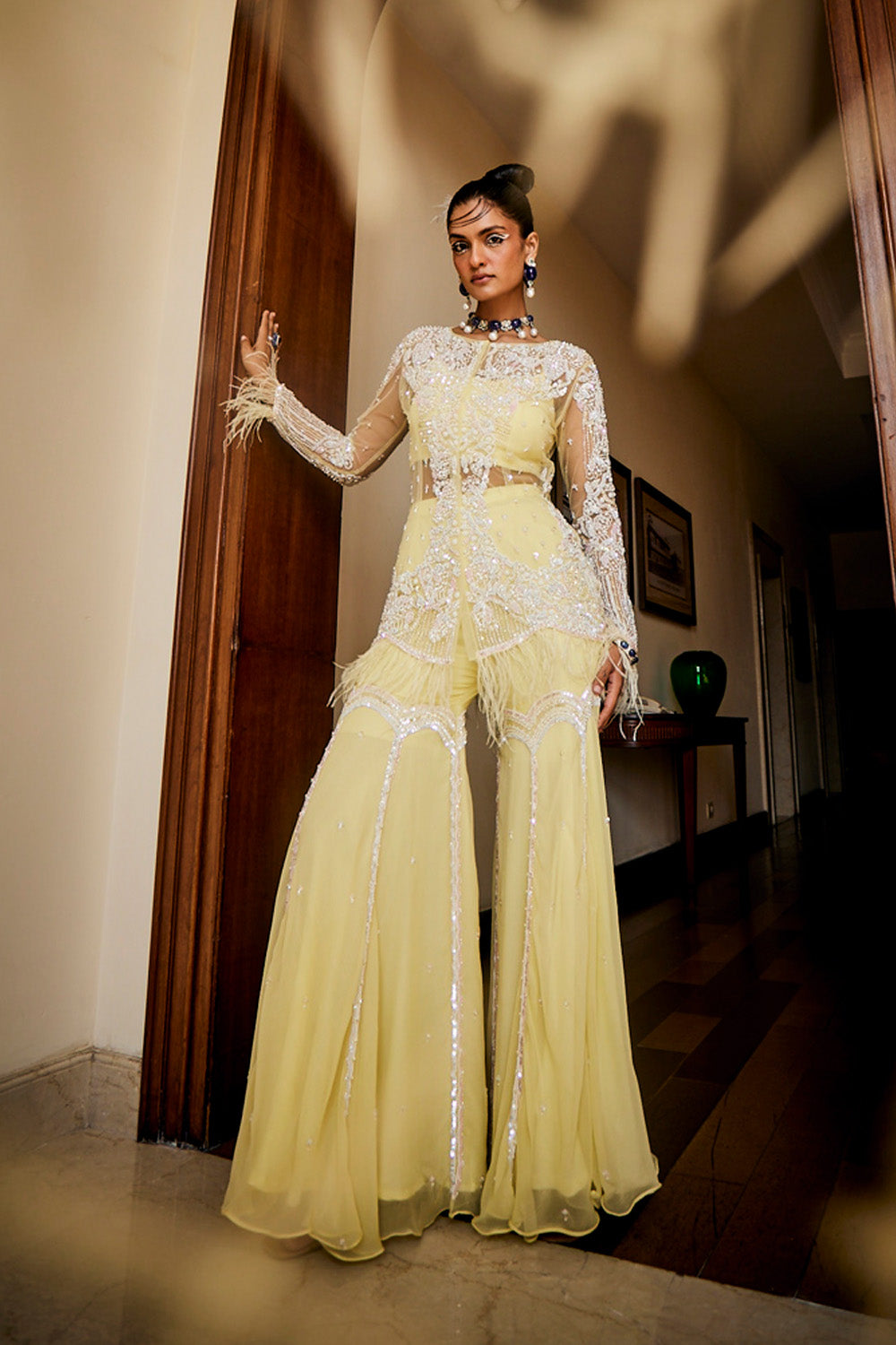 Lemon chiffon jacket, bustier & gharara set