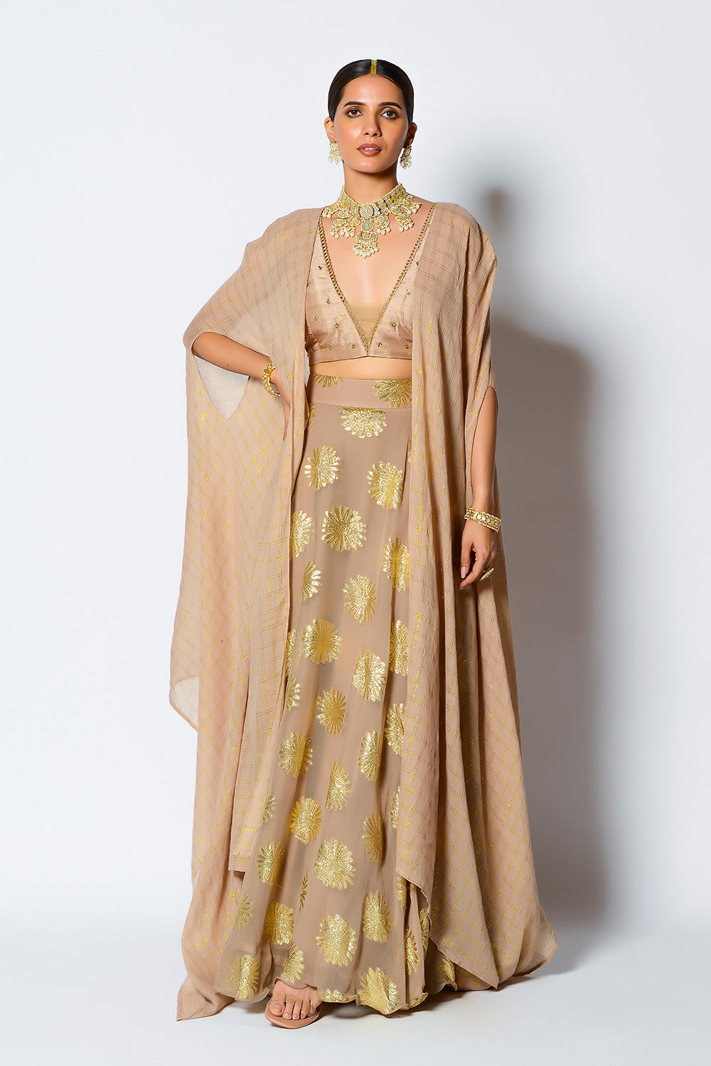 Featuring a sequence work on golden color blouse in dupion silk base along with a circular skirt in foiling georgette & cape.