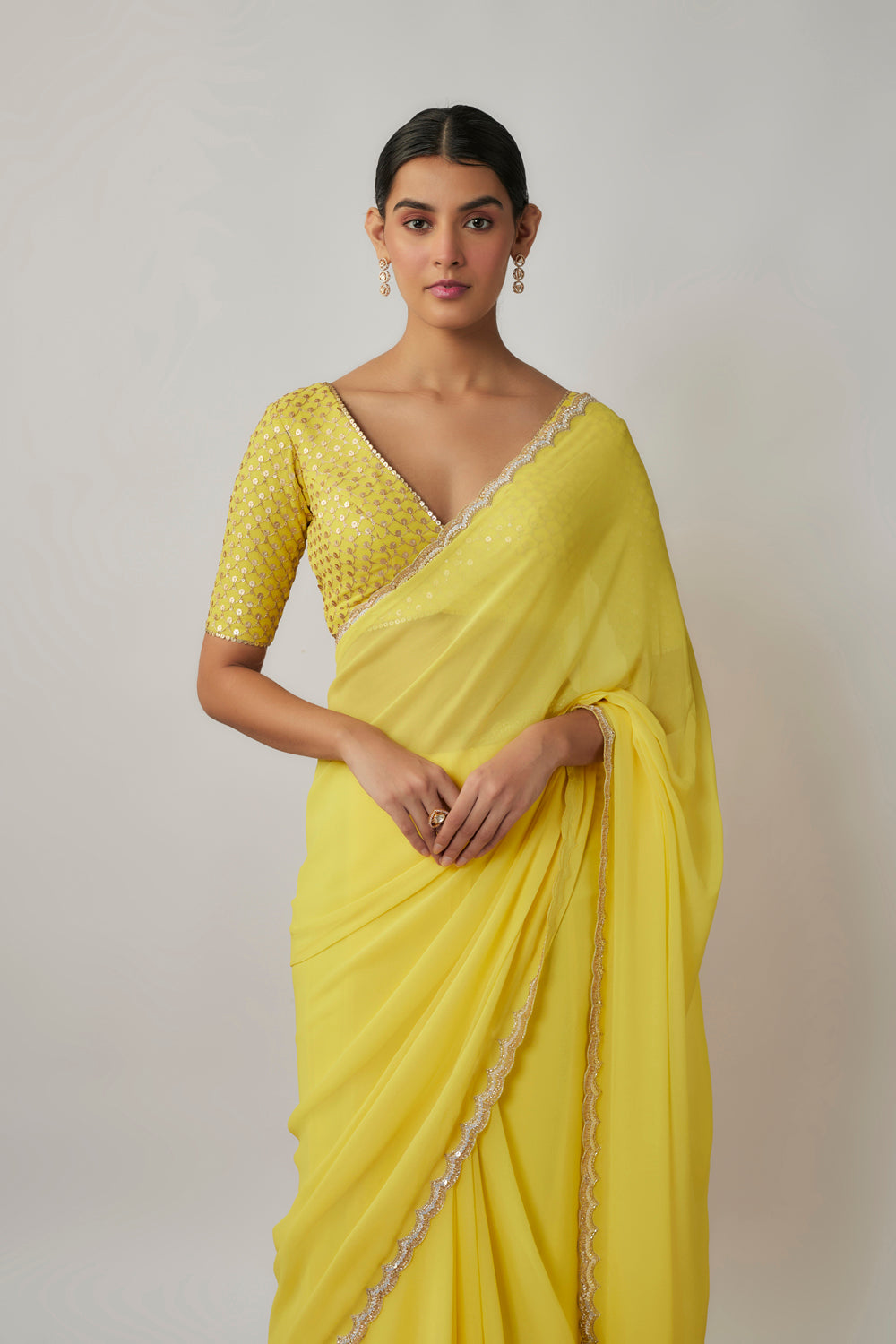 This look features a lemon yellow and gold saree set. the georgette blouse has elbow sleeves with scallop pattern, sequin embroidery. it is teamed with a matching plain georgette saree with a delicate gold cutwork border. an underskirt is included in the set.