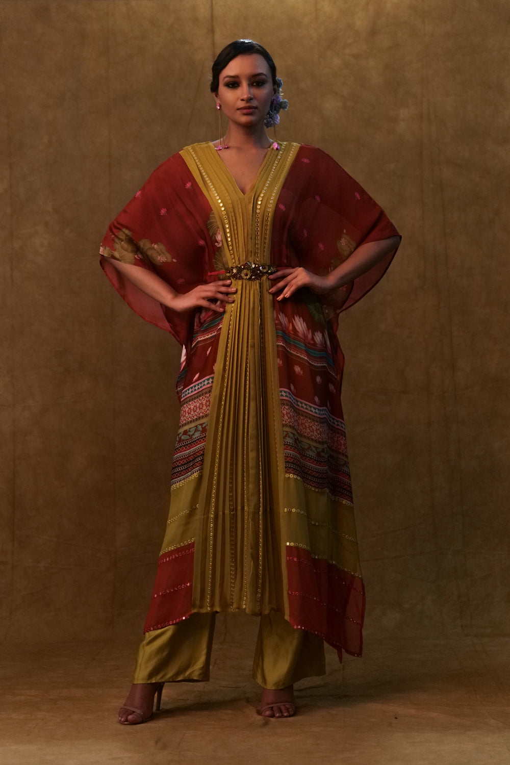 Kaftan set combing maroon and olive green shades offers a rich and distinctive aesthetic. living with sequins and stone work to enhance theor elegance and appeal