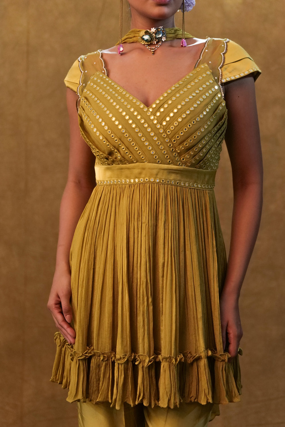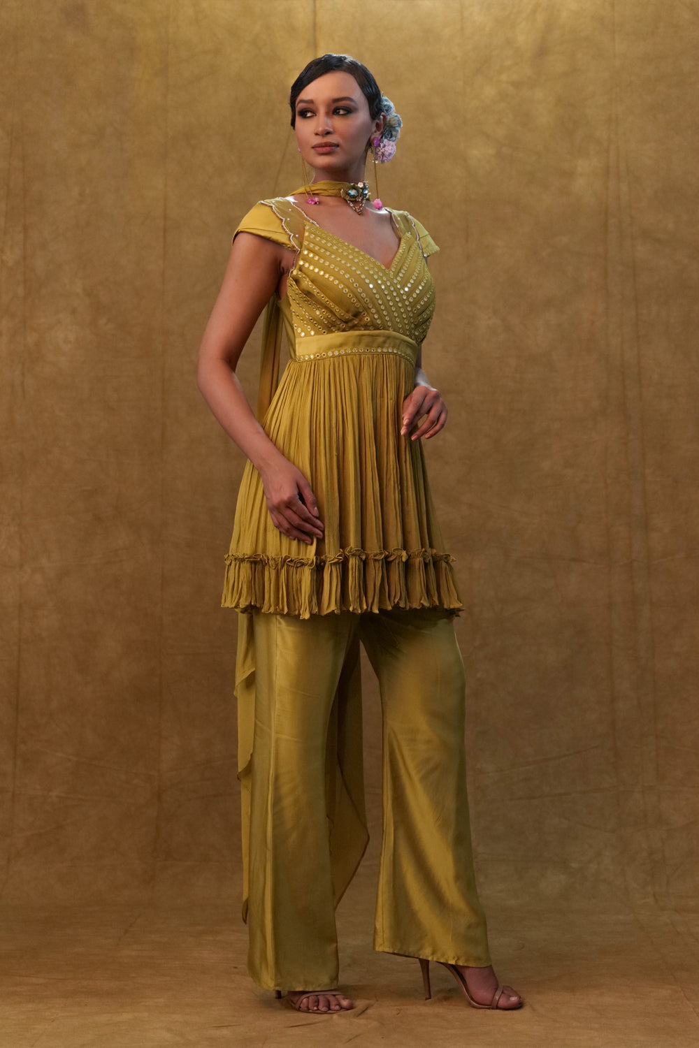Olive Peplum Set Paired With Pants And A Neck Dupatta