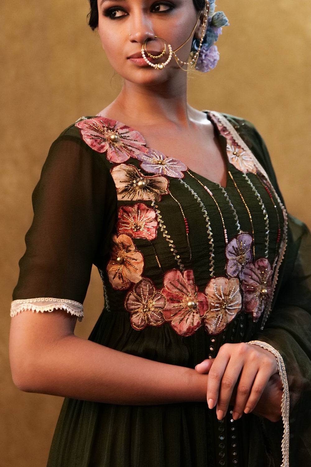 A mesmerizing green shaded anarkali set embellished with delicate applique work epitomizes grace and tradition, the varying tones of green create a subtle gradient , adding depth to the enemble