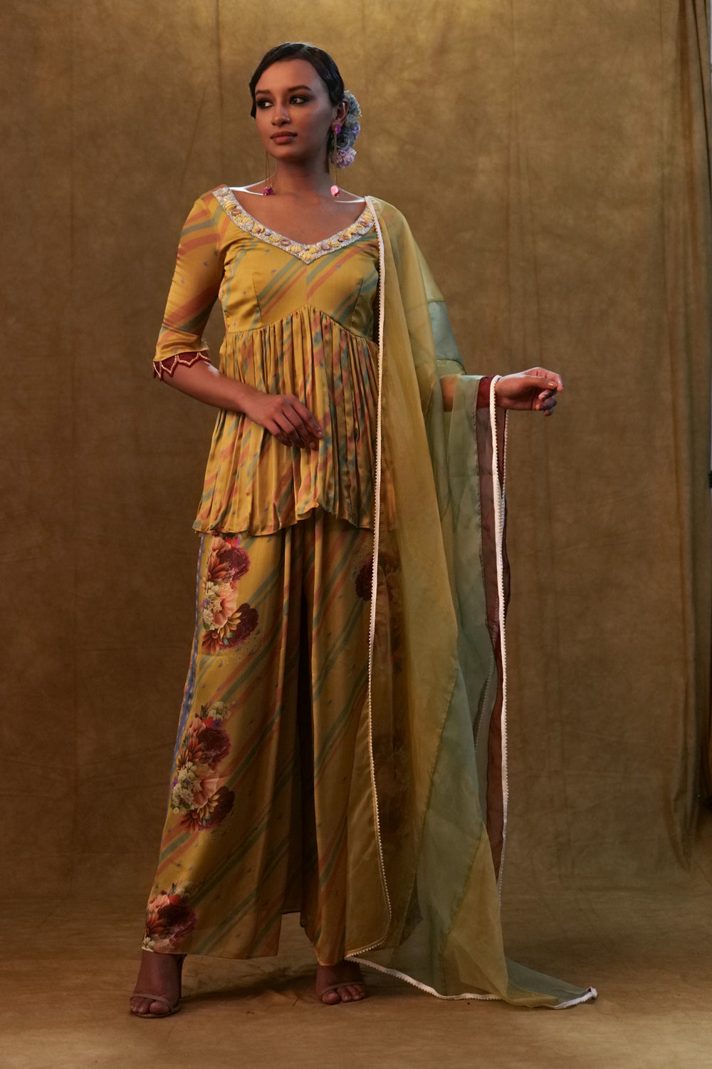 Mustard sharara set adorned with floral prints and delicate shell work exudes a blend of vibrancy and intricate craftsmanship. the shell work detailing, meticulously placed across the ensemble, ofeers a subtles shimmer and texture