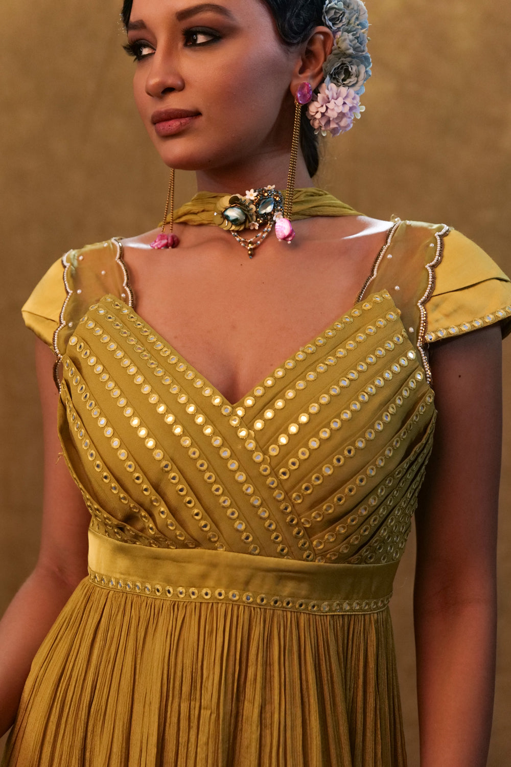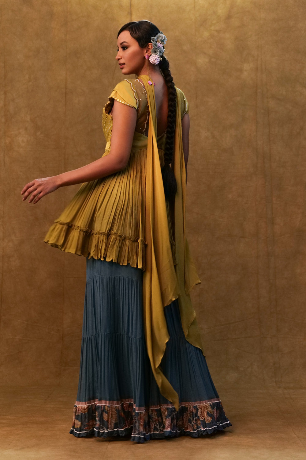 Olive green peplum sharara set paired with a blue printed bottom emblellised with pearl details. the combination of olive green and blue can create eye- catching contrast, specially with the added elegance of pearl and stone embellishment